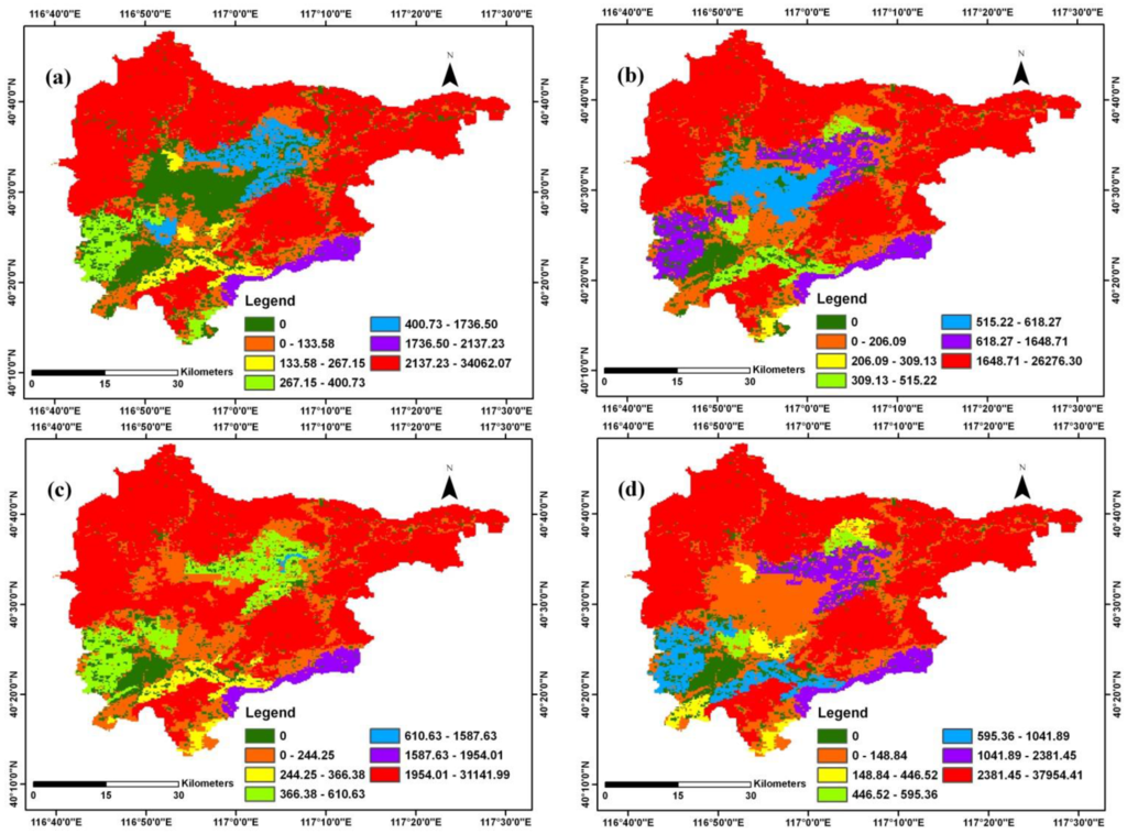 From the spatial distribution of total ecosystem service value (Figure 5, Figure 6, Figure 7 and Figure 8), 0–245.85 104 Yuan/a is distributed in most regions in 1991, 0–31.71 104 Yuan/a is mainly distributed in the eastern and southwestern regions in 2006, 0–809.28 104 Yuan/a is mainly distributed in the northeast and south in 2021, and 0–1667.79 104 Yuan/a is distributed in most regions under the improved scenario.