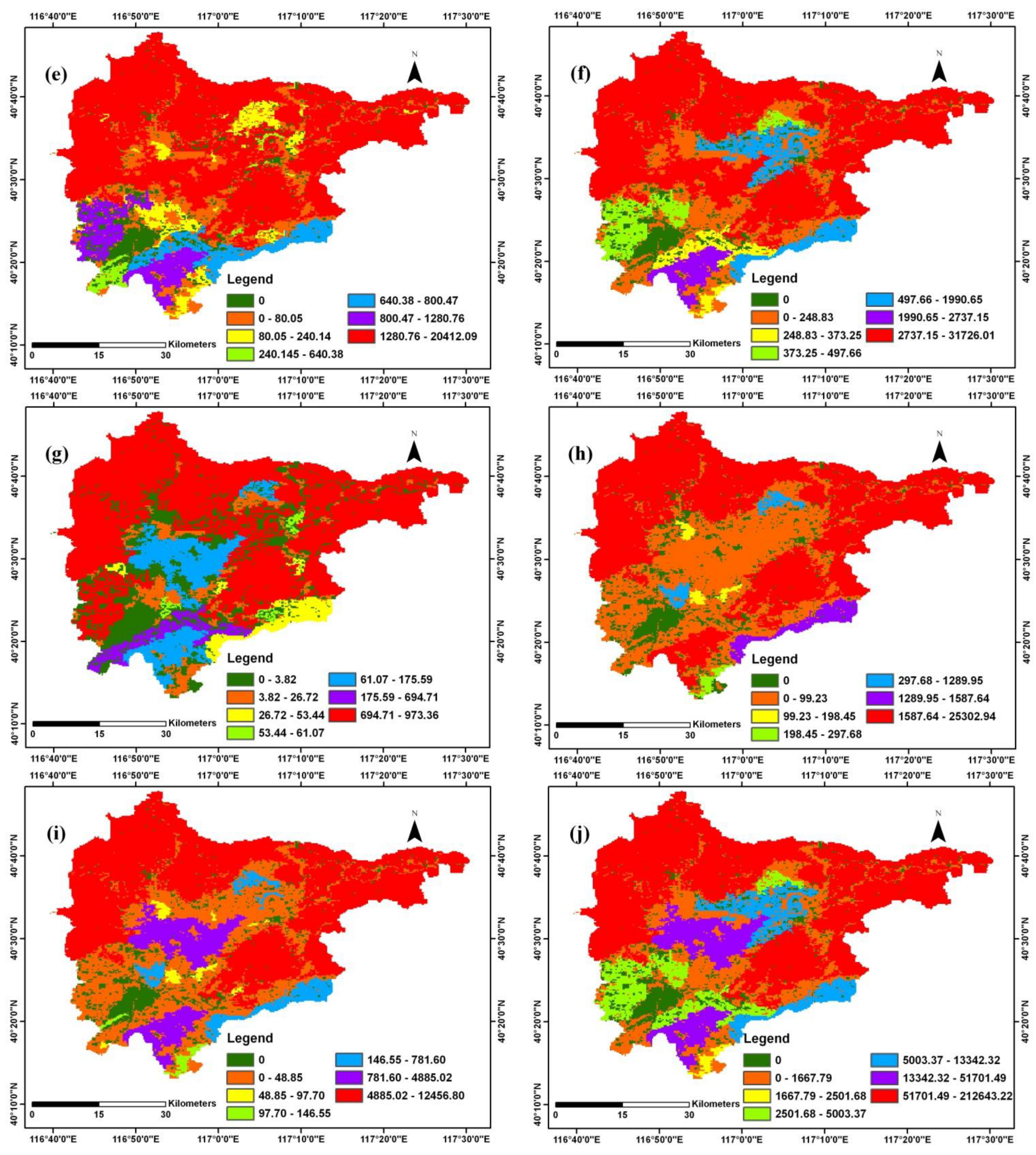 Spatial distribution of the ecosystem service value in Miyun in 1991 (104 Yuan/a). (a) Gas regulation; (b) Climate regulation; (c) Water supply; (d) Soil formation and retention; (e) Waste treatment; (f) Biodiversity protection; (g) Food; (h) Raw material; (i) Recreation and culture; (j) Total ESV.