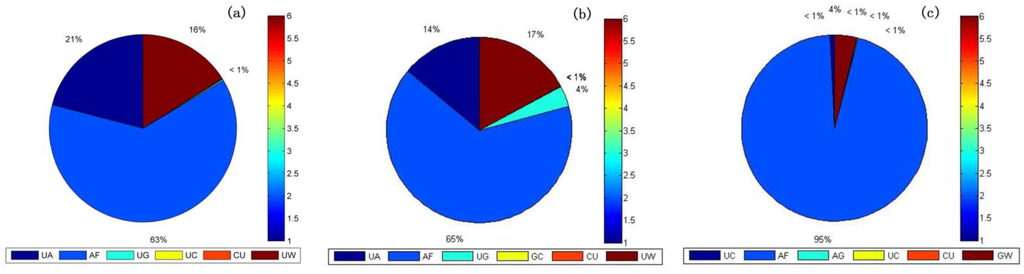 The capital letter W denotes water bodies, U denotes unused land, C denotes construction land, G denotes grass land, F denotes forest cover, and A denotes arable land. UA refers to land use change from unused land to arable land, AF refers to land use change from arable land to forest cover, and so on.
