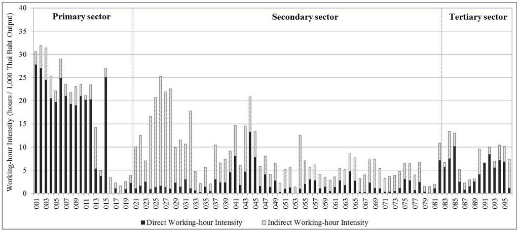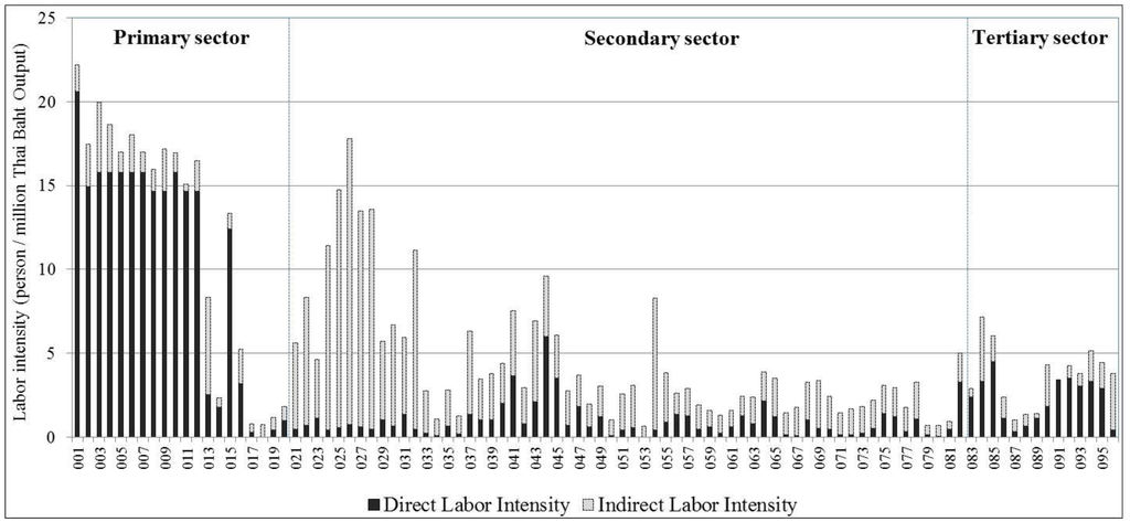 From Figure 1, it was found that in 2005, direct labor intensity in the agricultural sector was very high. Given high labor employment in this sector, it largely dragged down the country’s overall labor productivity. The result showed that the employment intensity in the agricultural sector has greater direct labor intensity, whereas the industrial sector has a higher share of indirect labor. Especially, food processing sectors have a greater portion of indirect labor due to the influences from the primary sector. It may be caused by the impact of food crops as raw materials. More than 50% of labor use was indirect labor in most manufacturing sectors in Thailand. For the tertiary sector, the restaurant and bar sector showed the greatest employment intensity; 54% of the labor is indirect labor. The next was the hotel and guest house sector followed by medical and sanitary services sectors, respectively.