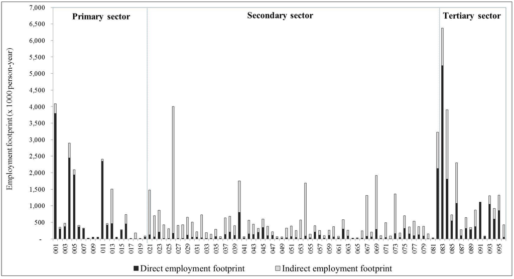 - Alsamawi, A.; Murray, J.; Lenzen, M. The employment footprints of nations. J. Ind. Ecol. 2014, 18, 59–70. [Google Scholar] [CrossRef]