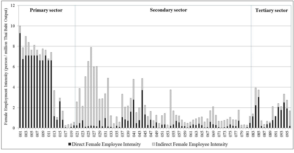 Figure 3 shows the female employment intensity from 96 industrial sectors. The largest female employment intensity is paddy rice accounting for 9.98 person-year/million Thai Baht output. The high intensity in the paddy crop was attributed to the low economic value of the product with a great deal of labor used in the cultivation. The next was cassava (8.96) followed by beans and vegetables (8.38), sugarcane (8.10), rice milling (7.89), maize and other grain (7.85), tobacco (7.76), fruits (7.63), oil palm (7.62), and coffee and tea (7.62), respectively. The result shows that the female employment intensity is in line with the total employment intensity. There are only 19 industrial sectors in which the female employment proportion is more than male employment. Especially, the secondary and tertiary sectors including textiles and leather products, coffee and tea processing, wood and cork products, electrical and electronics industry, hotel, restaurant, sanitary and similar services, education and research, medical, and other services. In the secondary sector, the result showed the highest numbers pf recruits of female workers were in the textiles and electronics sectors. The overall labor force participation rate of female workers is 14.5% below male workers. Female workers should take up more paid employment and seek gender equality.