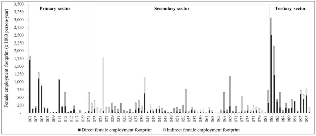 Figure 4 shows the results of the female employment footprint, which is similar to the total employment footprint in some rankings. When compared with the female employment intensities, the ranking changes and the most important female labor intensive sector becomes the wholesale and retail trade sector (direct 2.51 and total 3.06 million person-year), followed by restaurant (direct 1.21 and total 2.14 million person-year), paddy (direct 1.71 and total 1.84 million person-year), rice milling (direct 0.05 and total 1.78 million person-year), beans and vegetables (direct 1.10 and total 1.30 million person-year), radio and television (direct 0.21 and total 1.19 million person-year), clothing except footwear (direct 0.63 and total 1.15 million person-year), rubber (direct 1.06 and total 1.08 million person-year), fruits (direct 0.87 and total 0.94 million person-year), and other services (direct 0.56 and total 0.81 million person-year), respectively. These results stem from the high final demand of the wholesale and retail trade, radio and television, restaurant, clothing except footwear, and other services sectors that have smaller female employment intensity. At the same time, the small final demand of paddy, beans and vegetables, rubber, fruits, and rice milling sector implies a bigger intensity of female employment. The bigger, indirect female employment is in the rice milling and restaurant sectors due to the agricultural sector using raw materials.