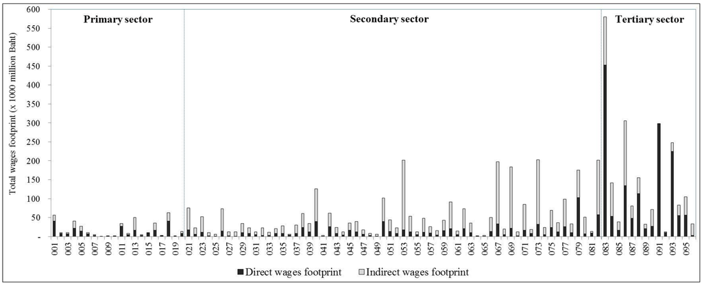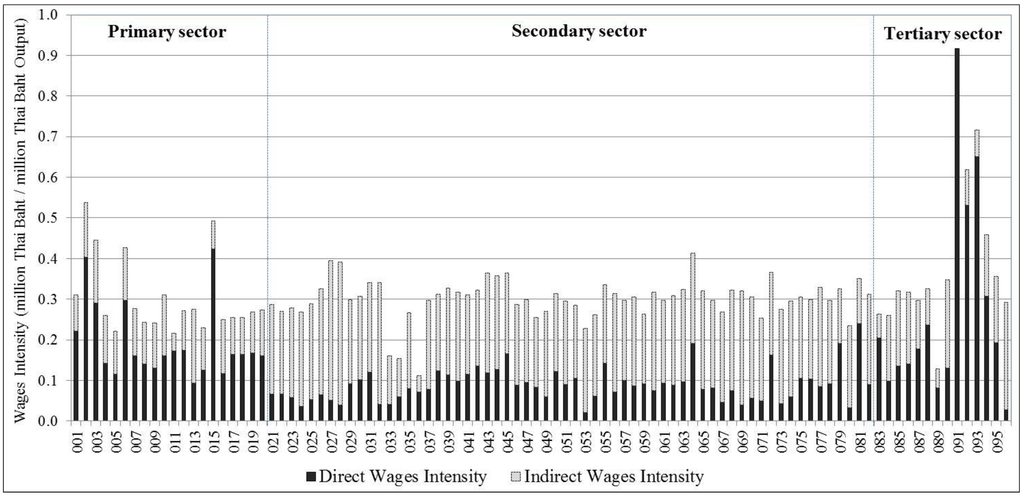 The total wages intensity from 96 industrial sectors is given in Figure 7. The largest wages intensity is public administration sector accounting for 0.92 million Thai Baht/million Thai Baht output. The highest intensity in the public administration sector was due to this sector accounting for only labor compensation and depreciation but it does not have input from others sectors. The next was education and research (0.72) followed by sanitary and similar services (0.62), maize and other grain (0.54), forestry (0.49), medical (0.46), cassava (0.44), and sugarcane (0.43), respectively. The result shows that almost all the primary and service sectors have greater direct wage intensity whereas the secondary sector had a higher share of indirect wages intensity. This is due to Thailand being categorized as a middle-income country, with an intermediate level of production technology. The key industries in the manufacturing sector use low wages as a base for competitive advantage. Thus, the secondary sector had a lower share of direct wage intensity.