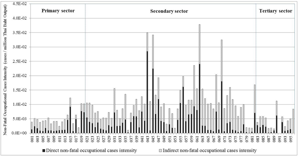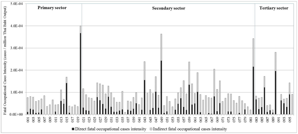 The database for occupational accidents and fatalities was gathered from Thailand’s Social Security Office [38]. The database included only formal labor (permanent labor) defined under the Thailand Social Security Act. The database excluded informal labor and public servants. The accident and fatality statistics were allocated to each sector based on sectoral economic outputs.