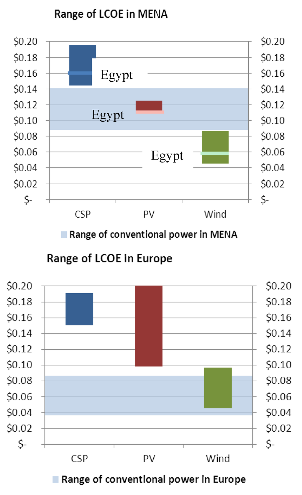 Moreover, from an economic point of view, renewable technologies in Egypt are competitive with conventional technologies in both the MENA region and Europe (see Figure 1).
