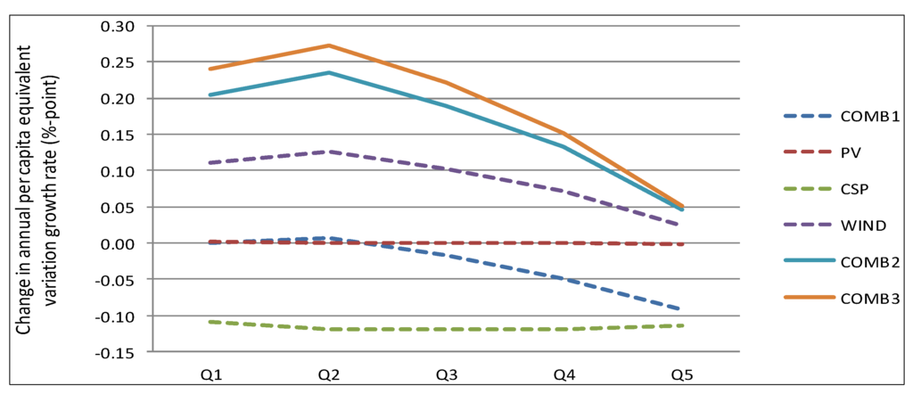 In addition to reducing CO2 emissions, the development of renewable energies may also have positive effects on countries’ economic development. The early and broad diffusion of RET would not only slow down the increase of global carbon emission but also allow economies to “leapfrog” over the use of conventional energy resources like oil, coal, or gas toward production technologies reliant on more climate-friendly power [9,10]. Diversifying electricity generation through RET may be particularly important in light of potentially rising future energy costs and geopolitical risks related to mineral resources (energy security). In addition, renewable energies may create jobs and thus foster economic development. Several studies to date have been comparing job creation effects of RET deployment with conventional power generation (see [11]). The general picture shows that, on a per-megawatt basis, there are more jobs being created in solar and wind technology deployment than in conventional power technology. Finally, there may be other associated socioeconomic benefits, including the protection of resources, the reduction of air pollution, and improved health outcomes.