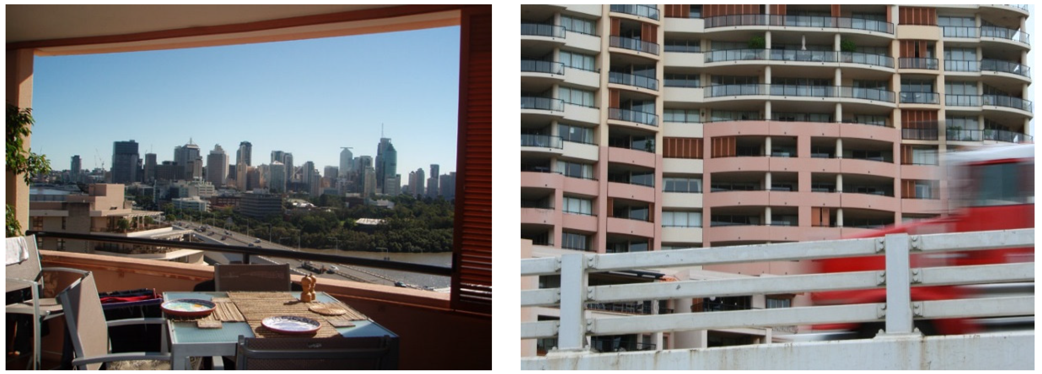 Climate-related lifestyle needs are frequently overlooked in residential environment satisfaction research, but are an important aspect of subtropical cities where the climate is conducive to outdoor living all year round. The subtropical humid climate zone has no distinctly dry season [15] and though summers are hot and humid, and winters are cool, the ambient outdoor temperatures (19–29 °C in summer and 9–21 °C in winter) are within a comfortable range for much of the year [16,17]. Humidity is the main factor affecting thermal comfort in subtropical settlements, and is most noticeable when air temperature is high and wind velocity is low [18]. Thus ways of generating air movement or capturing breeze are sought after when these conditions prevail in summer, and sometimes on autumn and spring days. In principle, MSABs can be designed to respond to the climate, by effective use of solar orientation of buildings and external shading devices to admit or exclude direct sun when seasonally appropriate, and siting of openings to effectively generate air movement to reduce the effects of humidity in summer [16,19], yet thermal comfort for dwellings is increasingly provided by air-conditioning. Despite the advantages and disadvantages of the mild subtropical climate, the climate zone is relatively under-researched, in terms of the relationship between climate, multi-residential building design and residents’ perceptions and experiences of this relationship. For example, many domestic activities are conducted in exterior private spaces such as verandas, balconies and terraces [20] and are a characteristic feature of multi-storey apartment buildings (MSABs) in subtropical cities like Brisbane (Figure 1). Residents occupying such spaces in dwellings in are potentially exposed to noise discomfort. Noise from external sources such as traffic and roof-top air-conditioning plant is prevalent in urban areas where MSAB are located. Residents using balconies may also be exposed to noise from neighbours, and may generate noise that could bother their neighbours.