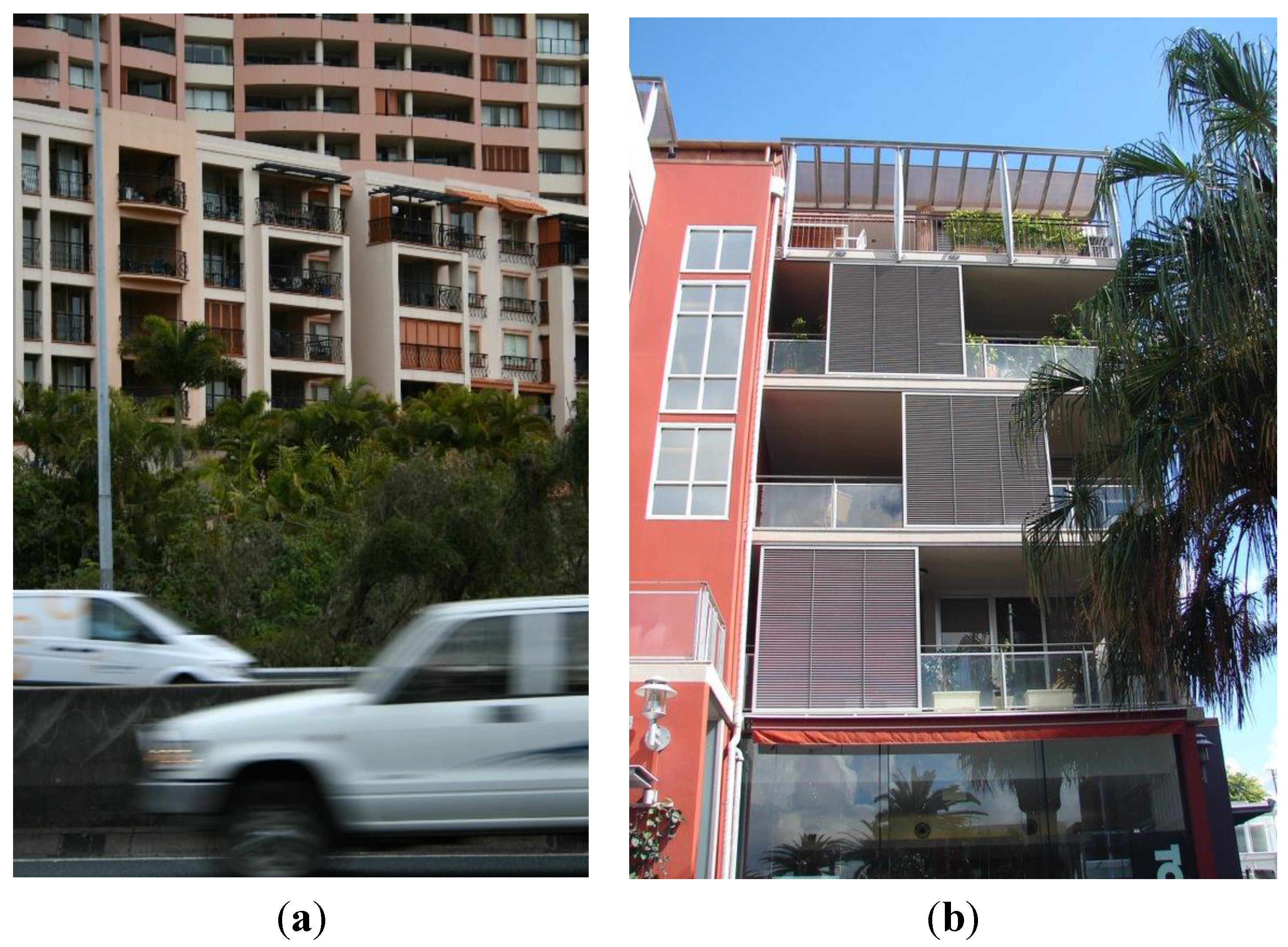 High-rise residential buildings often have large glazed areas where natural lighting levels are achieved but excessive solar heat gains or glare in both winter and summer, are introduced if orientation and external shading are inadequate [43,67]. These instances illustrate that objective knowledge is required to solve an array of problems simultaneously, but creative intuition is also required to provide practical solutions that respond to the human aesthetic and emotional needs of a user group (residents) with whom architects generally have no direct contact during the design process. In the subtropical humid climate, the challenge for designers is to find a balance between natural ventilation and noise, rather than designing solely for one parameter or the other. Environmentally, therefore, facilitating climate-responsive design in MSAB may help mitigate the need for air-conditioning, leading to direct reductions in apartment household energy use and contributing to the stated objectives of urban consolidation policies. In the urban environment, it seems there may be a need to provide air-conditioning as well as climate-responsive design. An ideal solution would combine the best practices of energy efficient specifications with strategically placed operable glazing that residents can adjust to capture prevailing breezes and allow daylight infiltration, exclude heat and glare, minimise unwanted noise, and provide privacy and views to the outside, according to their personal preference. Traditionally, the veranda has played this role in subtropical houses. In the MSAB, adjustable layers of external screening applied to openings and balconies may be one way of addressing multiple interrelated problems. Evidently some local apartment buildings already apply some of these principles (Figure 4) however, concerning issues for further design research are how to provide much-needed open space and personal climate control as towers increase in height and the effects of wind conditions make cross-ventilation difficult and projecting balconies extremely uncomfortable. Further, the influences of balcony structures on the environmental behaviour of MSABs also need careful examination in conjunction with functional criteria to enable residents of various building forms and configurations to benefit from the favourable subtropical conditions.