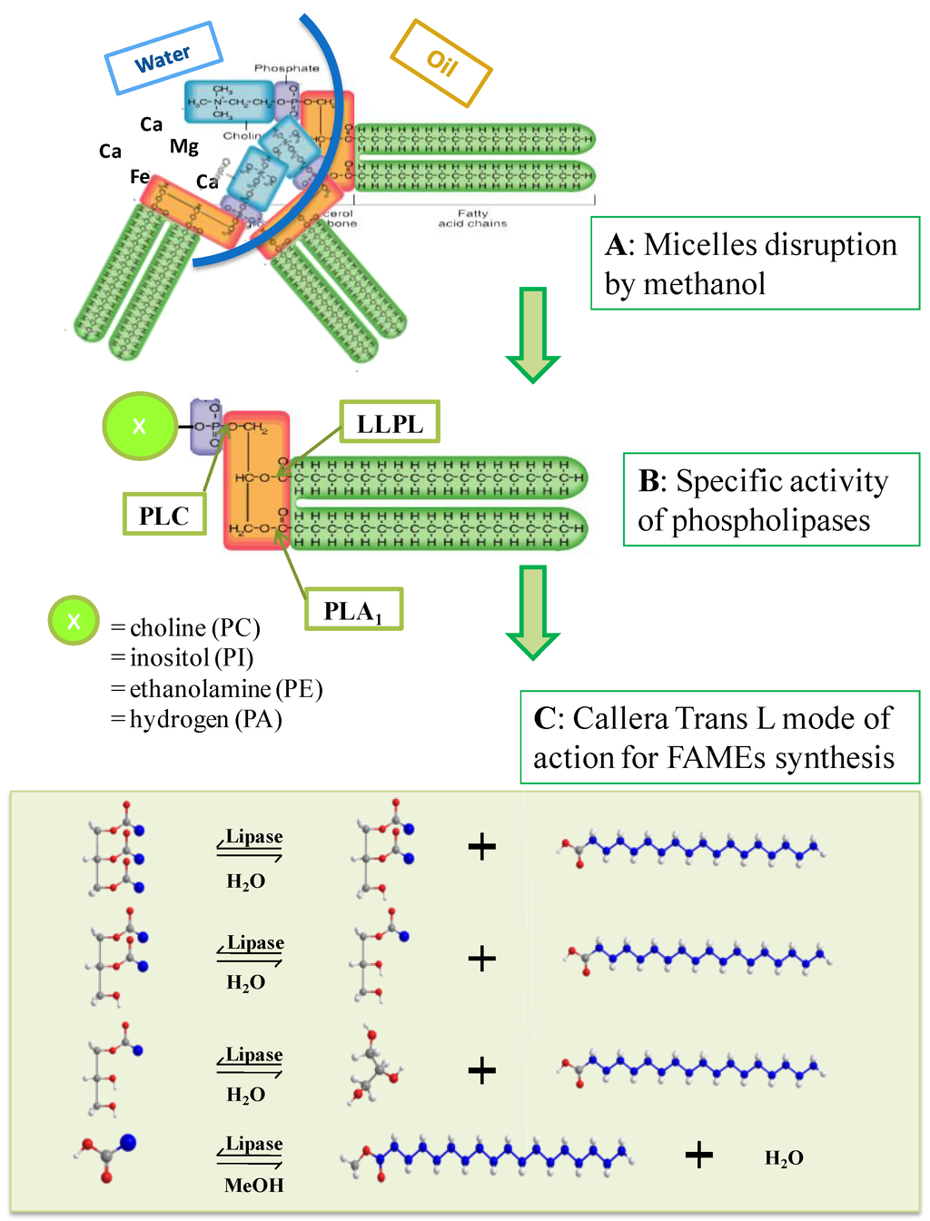 - Cesarini, S.; Haller, R.F.; Diaz, P.; Nielsen, P.M. Combining phospholipases and a liquid lipase for one-step biodiesel production using crude oils. Biotechnol. Biofuels 2014, 7. [Google Scholar] [CrossRef] [PubMed]