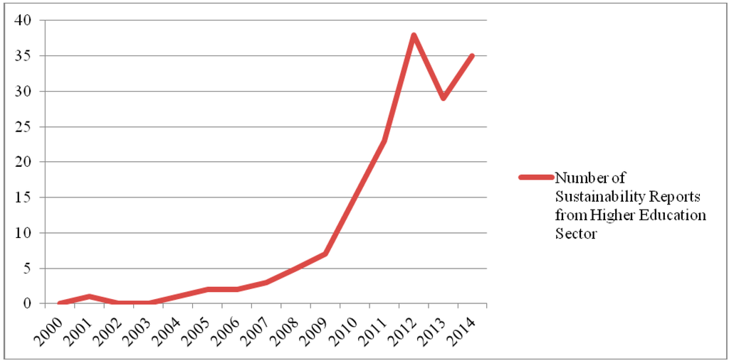 SR has mainly been led by multinationals and large corporations [32,33,34], for example the KPMG surveys of the largest 250 global companies in the world have shown an increase in reporting from 35% of those companies in 1999 to 93% in 2013 [35]. Other types of organizations (e.g., small and medium-sized enterprises (SMEs), non-governmental organizations (NGOs), governmental organizations, and HEIs) have also been engaging in explicitly reporting their SD efforts to their stakeholders [36,37]. In particular, HEIs have been publishing sustainability reports (see [13,14,15]), with an increase from one report in 2004 to 35 reports in 2014 (see Figure 1) [38]. Nonetheless, these numbers are still very low compared to the total number of HEIs in the world [15], estimated at over 20,000 private and public universities worldwide [39,40].