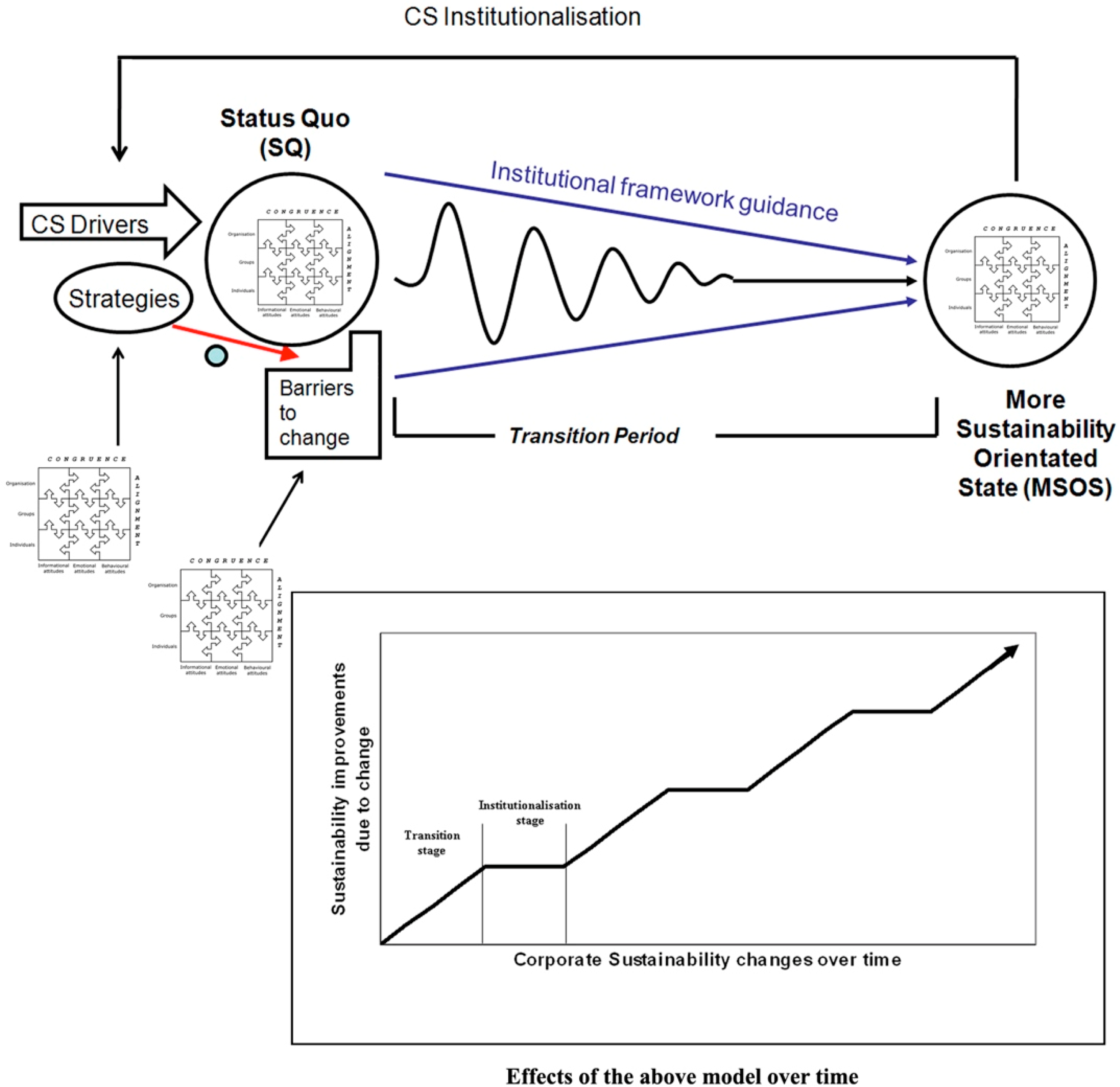 In this context, Lozano [28,74] proposed a framework, based on Bennis et al. [68], Lewin [56], Anderson & Ackerman Anderson [81], and Luthans [82], for explaining the dynamics of orchestrating change for corporate sustainability (see Figure 2). The framework depicts organizational change dynamics, where orchestrated planned change can disrupt the status quo (SQ) and help the move towards a More Sustainability-Orientated State (MSOS), in a continuously iterative process. The entire system and its elements need to be addressed holistically, and during the change, the drivers to change need to be recognized and fostered, whilst the appropriate strategies have to be applied to overcome barriers to change. The institutional framework can help to maintain stability during the changes, and thus facilitate SD institutionalization. During these changes, the system would pass through a transitional period, where the balance of the different forces adjust to each other, to reach the MSOS. Once this has been achieved, the MSOS starts becoming the status quo novo (SQN). The process has to start again after stabilization. Lozano’s [28,74] framework highlights that planning organizational changes, whilst engaging with the different organizational levels and their attitudes, could help organizations to better overcome resistance to change and integrate their efforts for sustainability more holistically.