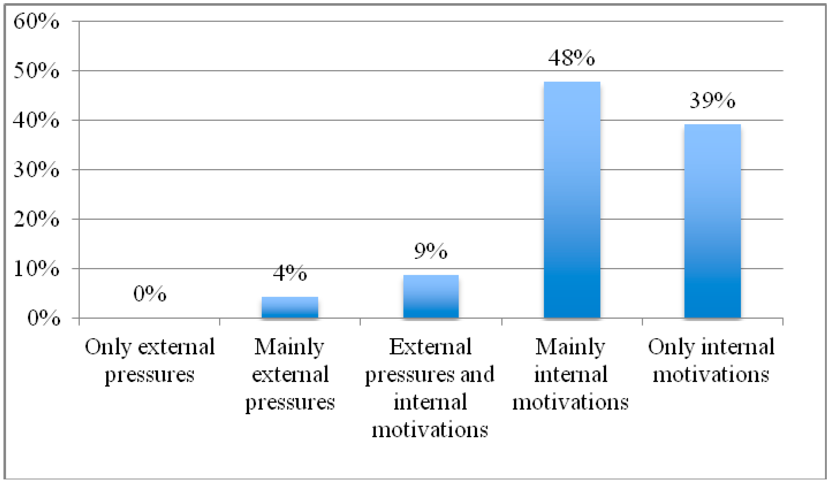 When prompted about the motivations for preparing a sustainability report (Figure 3), 39% of respondents stated that this was driven by internal motivations only, while 48% stated that external pressures were important, but even so, the report was mainly driven by internal motivations (compared to 0% “only external”, 4% “mainly external”, and 9% “both internal and external” motivations).