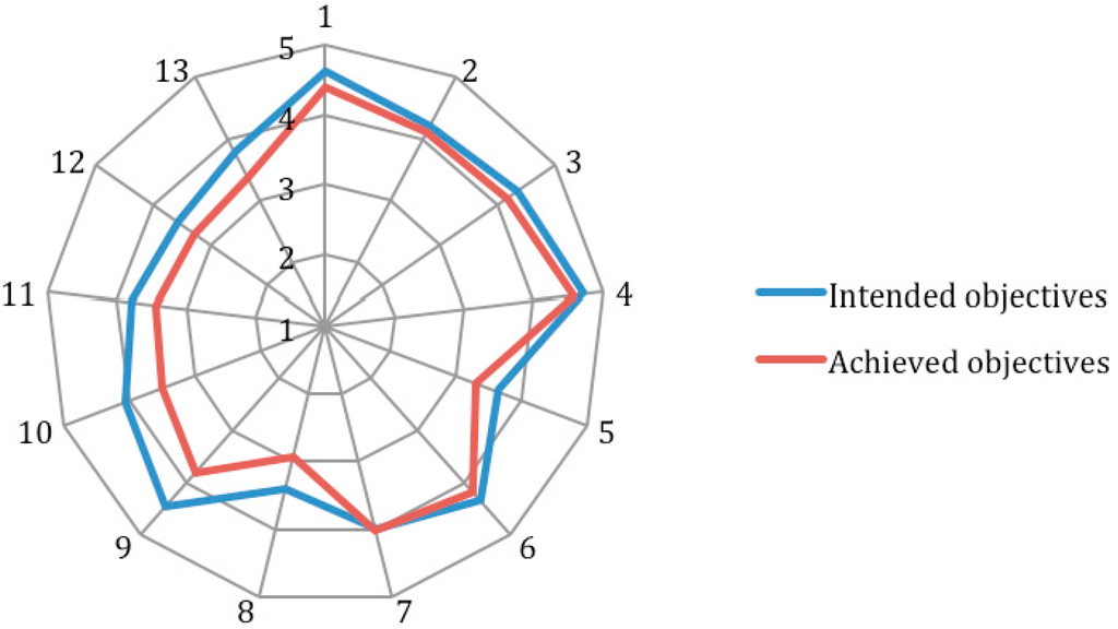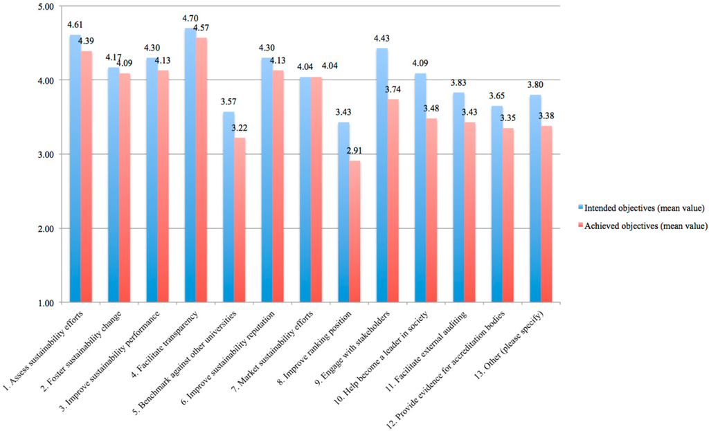 The differences between the “intended objectives” and the “achieved objectives” of SR in HEIs were analyzed using a t-test. The results of this analysis are presented in Table 1. It should be noted that the p-value provides information about the statistical significance of the differences between the objectives. As it can be observed in Table 1, the highest statistical significance of the differences between the 13 “intended” and “achieved” objectives were for “Help your university become a leader in society”, and “Engage with stakeholders about sustainability”. These were followed by “Assess your HEI’s sustainability efforts”, “Improve your university’s ranking position”, “Provide evidence for accreditation bodies”, and “Facilitate external auditing of your HEI’s sustainability efforts”. HEIs could improve the performance of their “achieved objectives” for these ones, or they could lower their expectations. It should be noted that the results may not be fully representative given the small sample size.