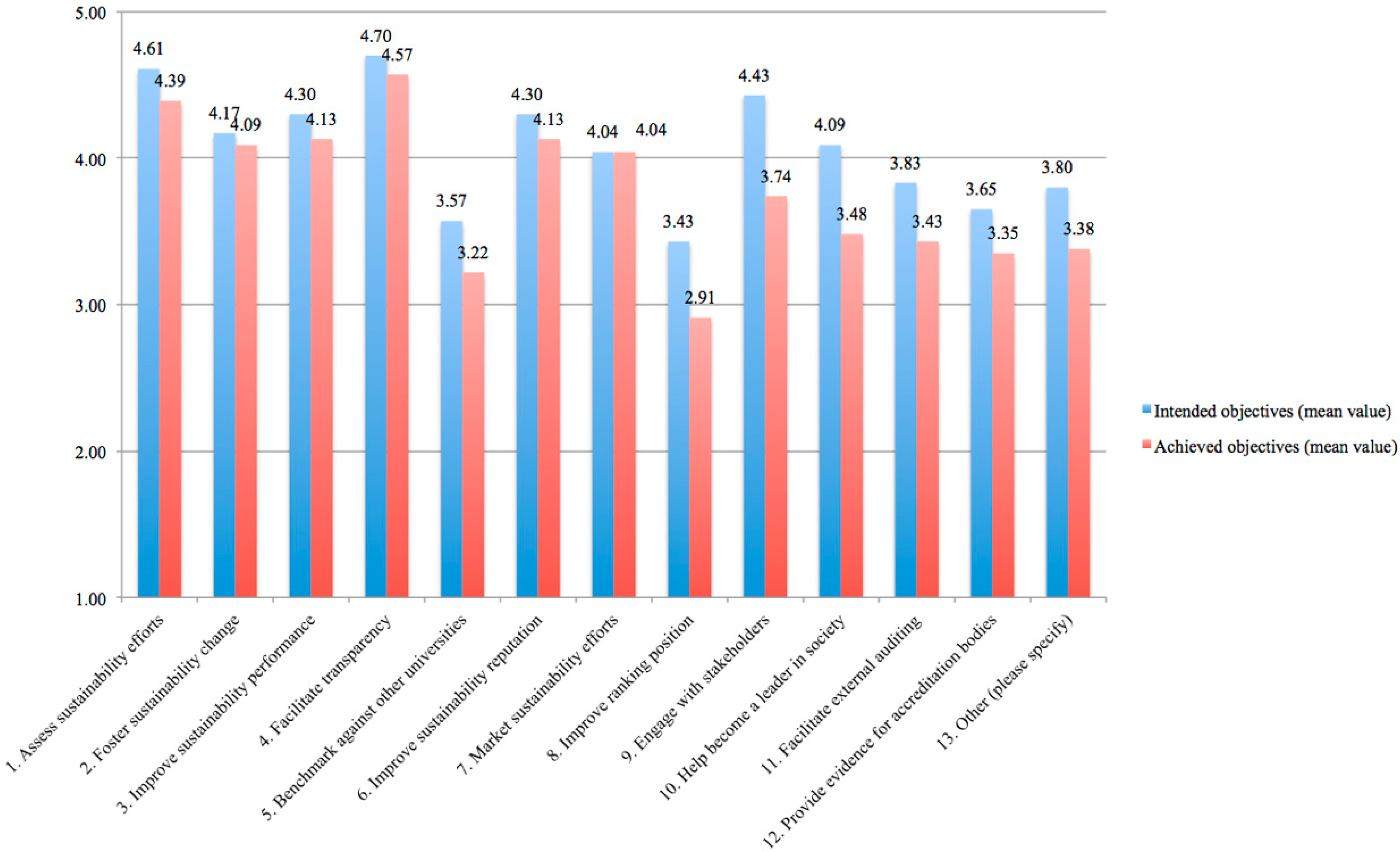 It should be noted that all of the objectives, except “improve ranking position” (mean value, achieved objectives: 2.91), scored higher than 3, i.e., on average, the respondents “agreed” with the proposed intended and achieved objectives of SR. The item “foster change for sustainability” scored relatively high for the intended and the achieved objectives of SR (i.e., respective mean values of 4.17 and 4.09).