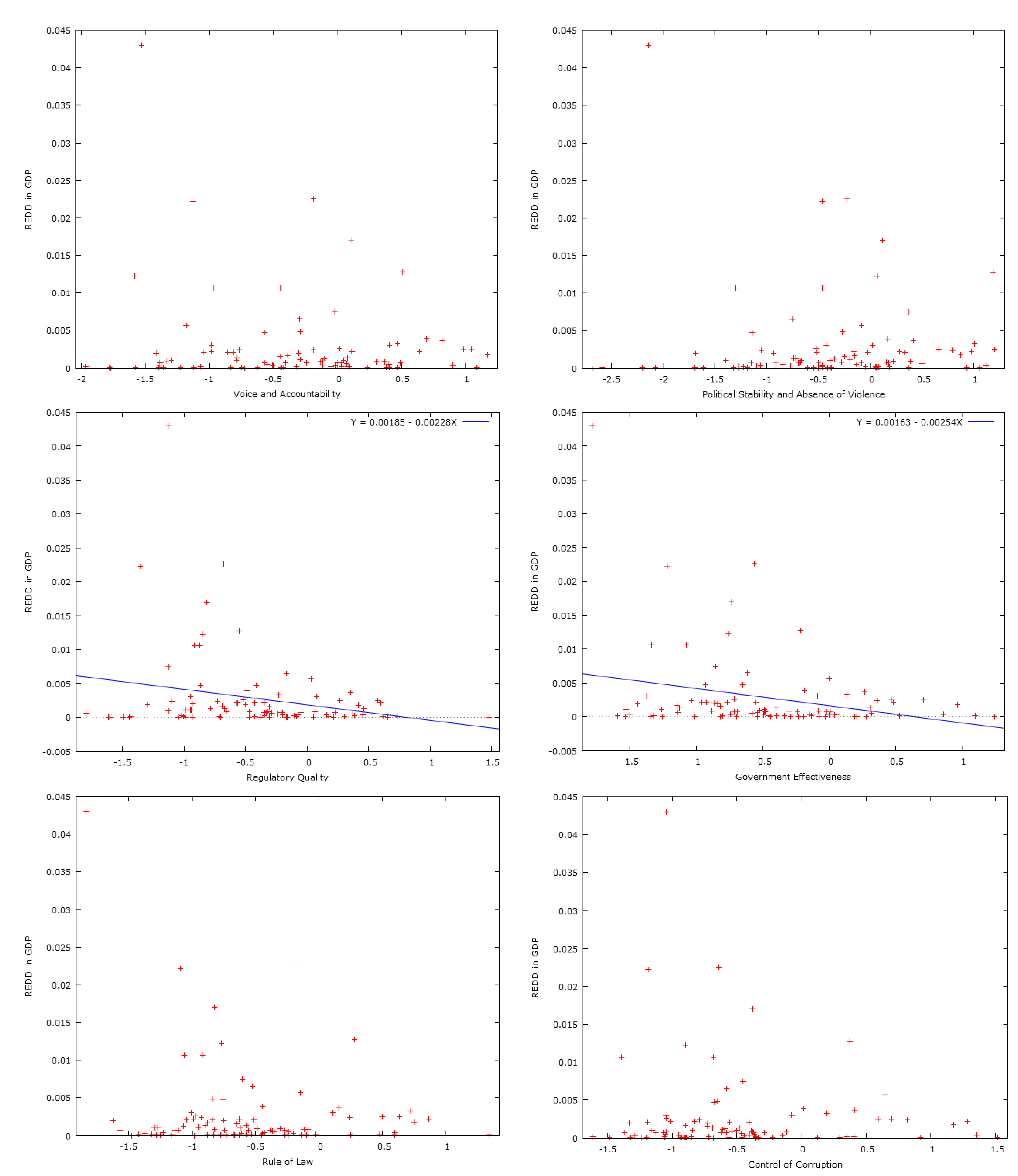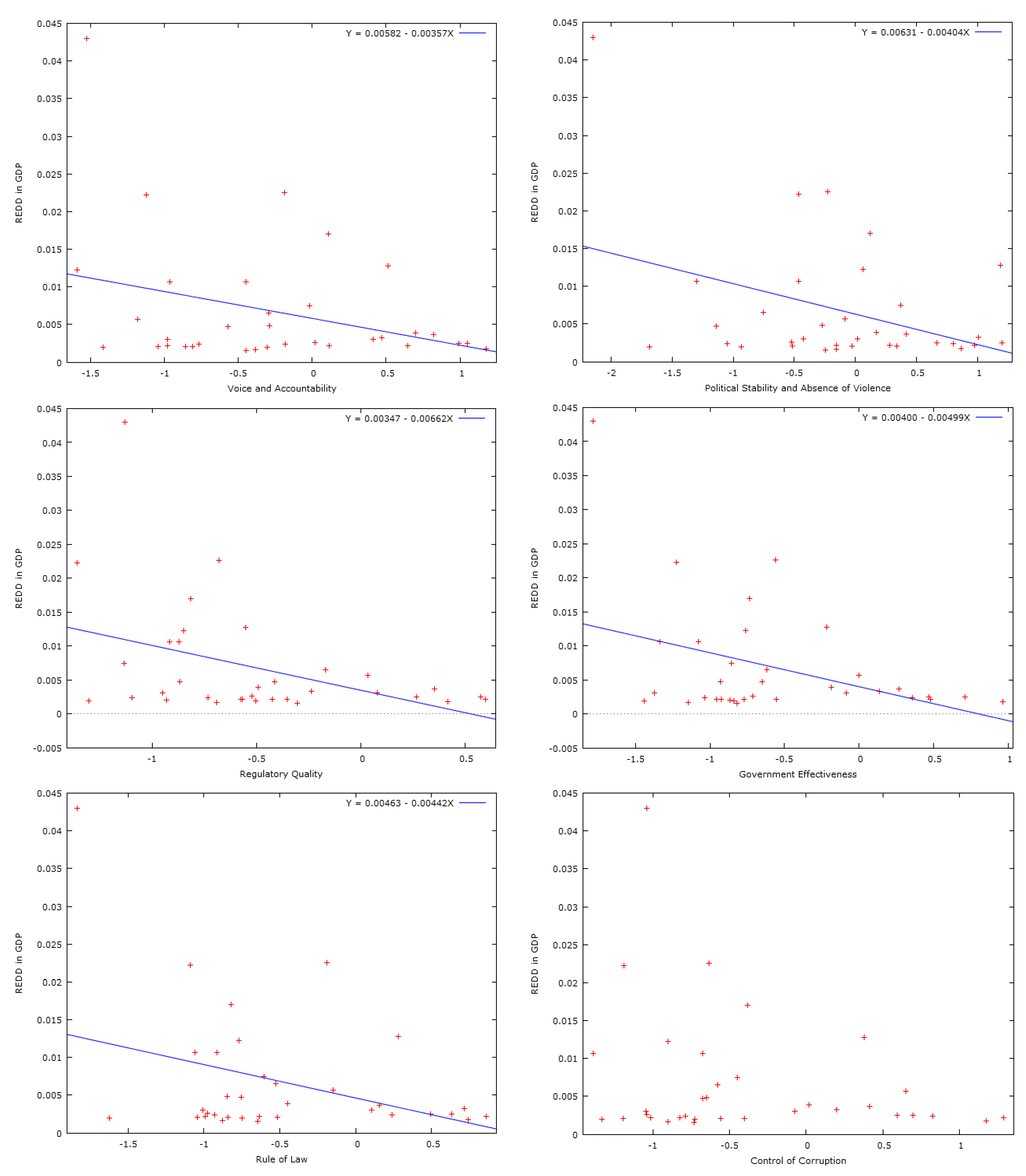 Figure 2 for this sample, which allows us to examine the situation in countries where REDD+ payments count more than in the rest of the countries previously analyzed. The only institutional quality indicator that does not exhibit a statistically significant correlation with REDD+ payments in the smaller sample is Control of Corruption. Finally, we also looked at the mean institutional quality indicator used by Ebeling and Yasué [