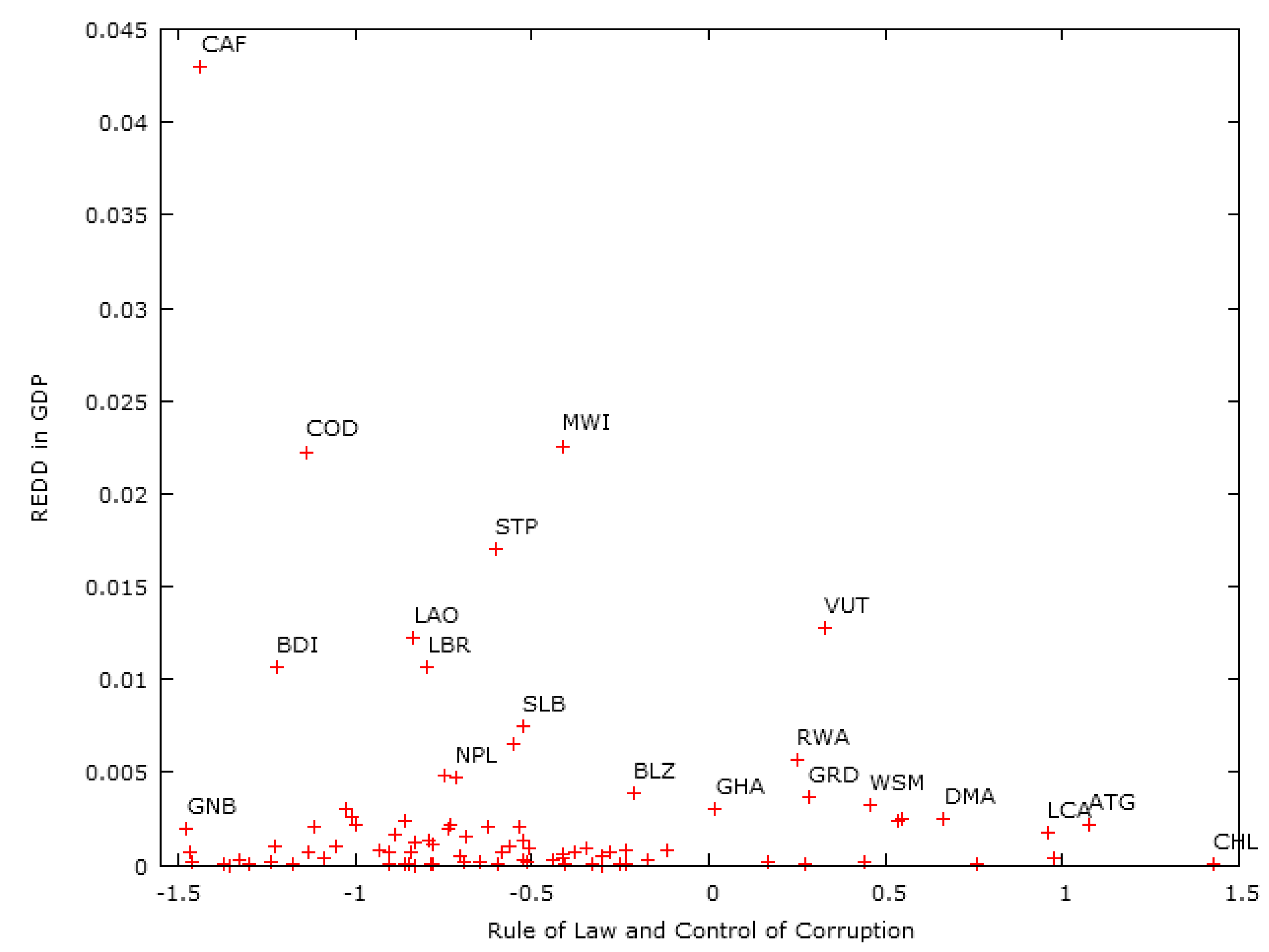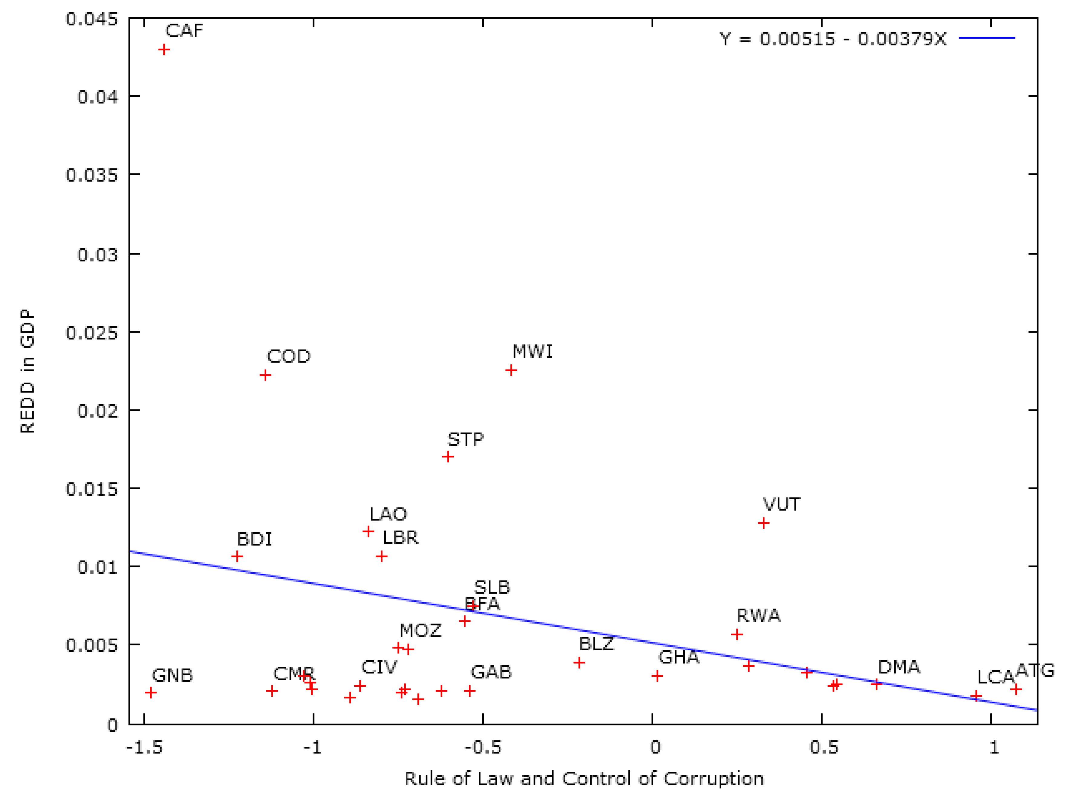 4], we used an average of two governance indicators: Rule of Law and Control of Corruption. These two indicators provide a very good illustration of a country’s ability to make the best of REDD+ payments. Also, as can be seen in