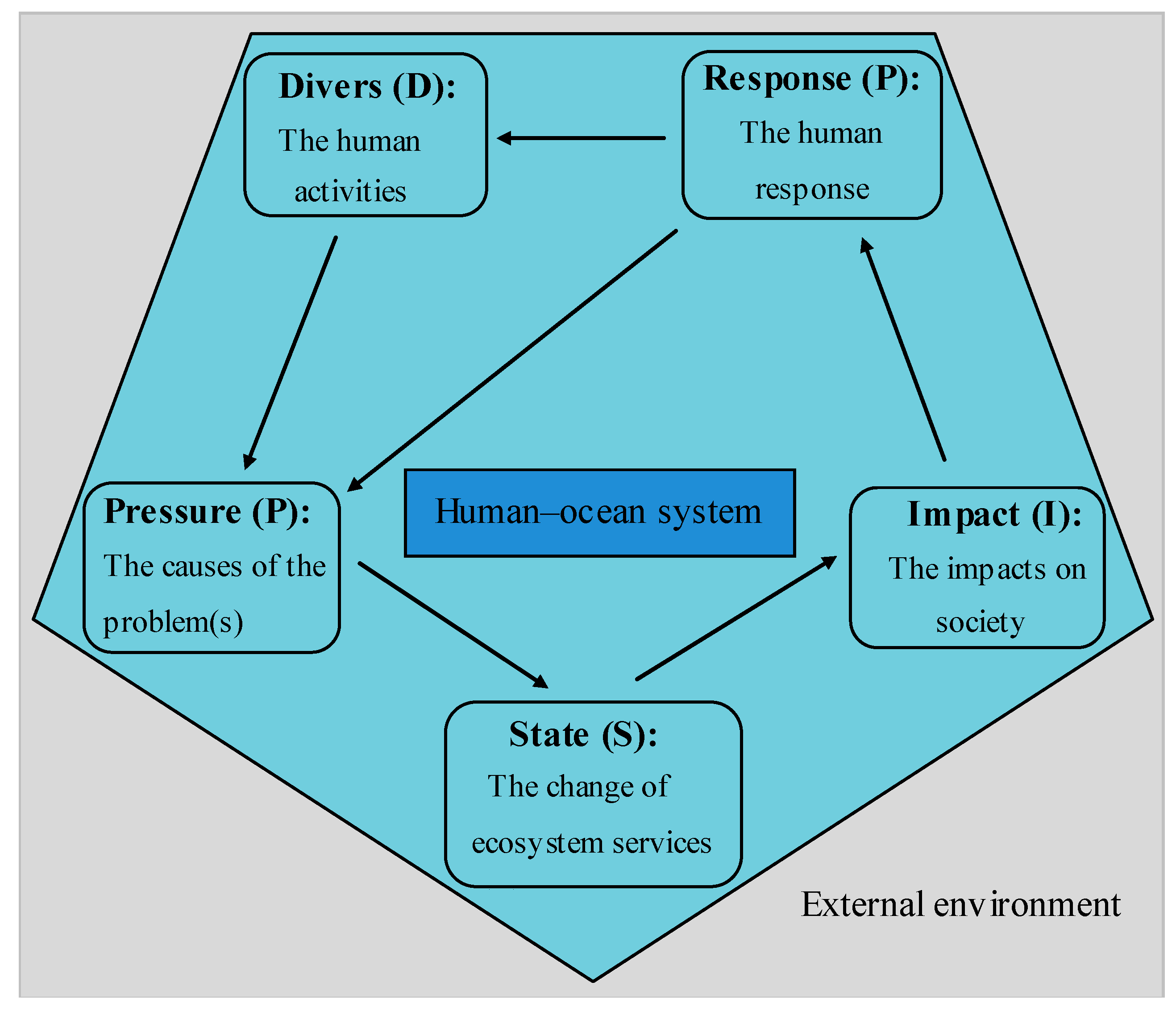 2.1. The Driver-Pressure-State-Impact-Response Framework Analysis of Human–Ocean Systems