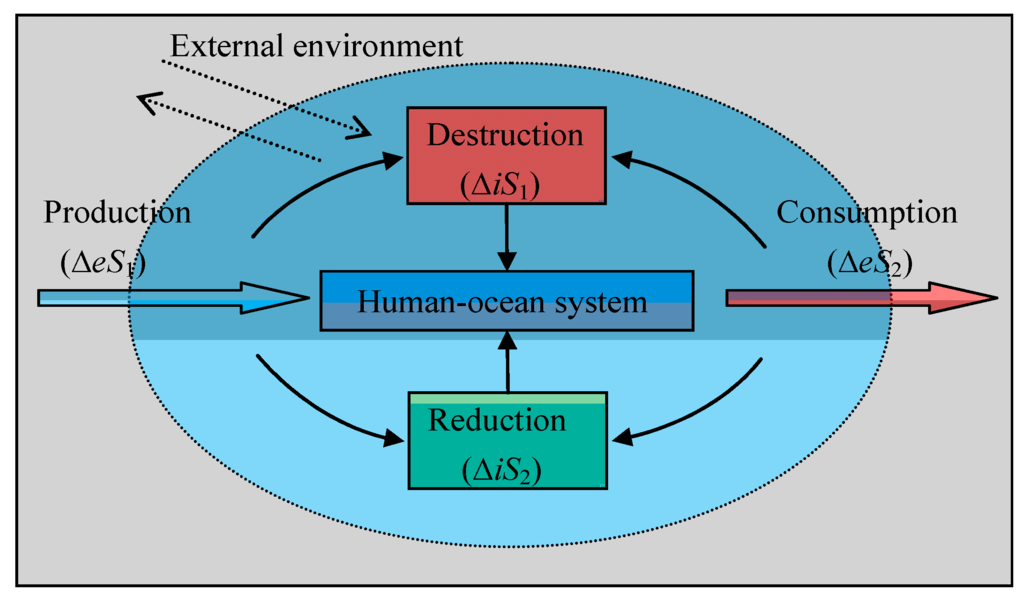 As open systems that are far from equilibrium during the process of exchanging matter and energy with outside environments, HOSs comply with the condition of dissipative structure, such that system evolution will follow the total entropy formula. deS is produced by exchanging material, energy, or information with its environment; the value of deS can be positive, negative, or zero. diS is generated from all types of feedback (both negative and positive) between human and ocean subsystems of HOSs. It is an inner, irreversible process of entropy increase; consequently, diS will always be positive. In addition, dS reflects the evolutionary direction and state of HOSs. In an isolated system, the second law of thermodynamics contains an “entropy increase” principle, so that dS is always greater than zero. However, to increase order within an open system, entropy reduction (negentropy) must be established in order to realize dS < 0. deS must be <0 and satisfy the condition |deS| > diS, because diS is positive. Thus, when the entropy of the system is gradually reduced, the system constantly evolves toward a more orderly state; conversely, higher entropy is associated with evolution toward a more disorderly state [37,38].