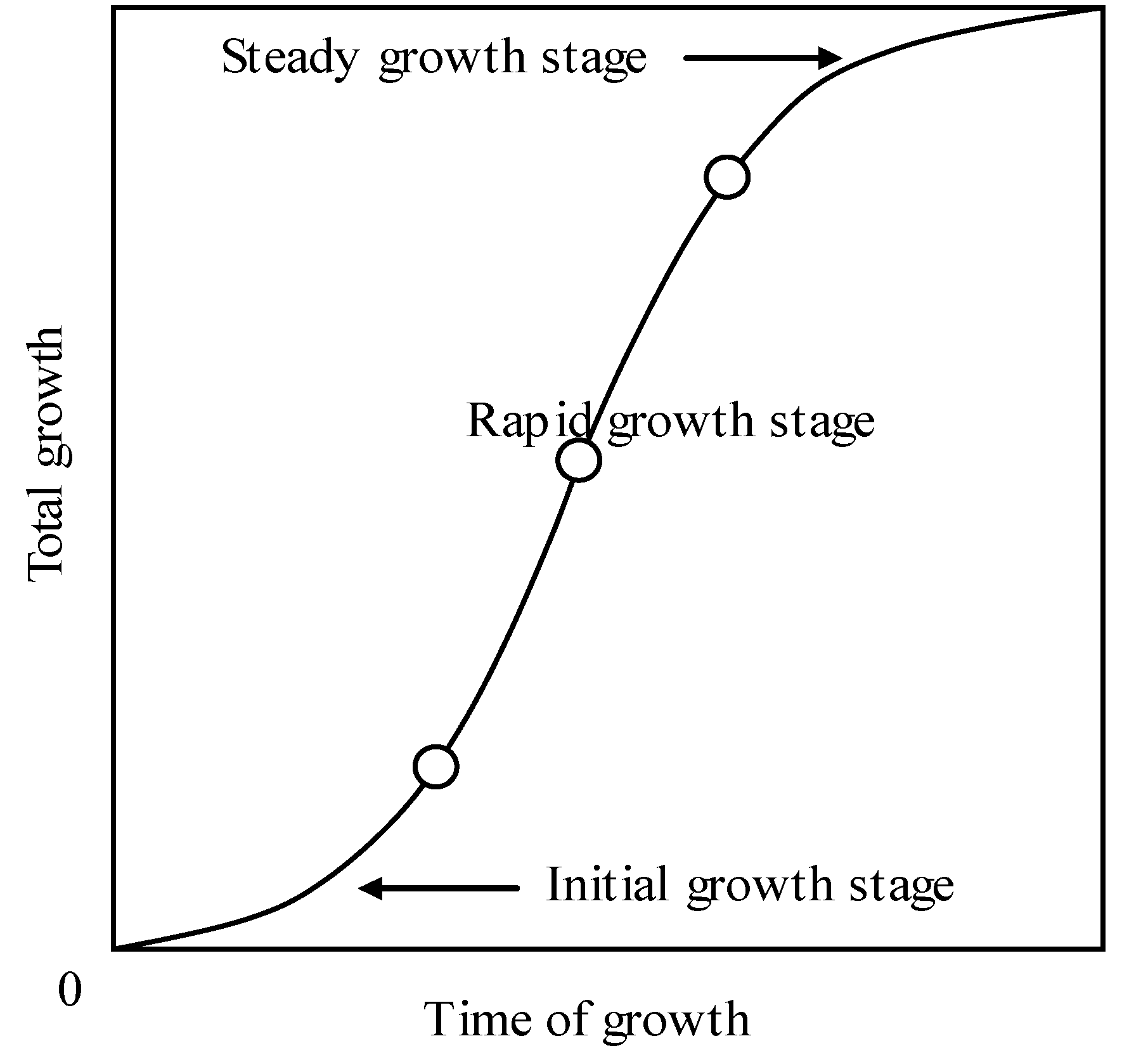 Socio-economic and biological systems entail complex structure and causality, undergo continuous change, and contain a great deal of diversity [50]; therefore, the biological metaphor is widely used in socio-economic fields. In this context, the biological model is referred to when studying the evolution of HOSs. The Richards model, proposed in 1959, is a mathematical method for describing the process of biological evolution [51,52]. It employs a sigmoid curve to represent the three evolutionary stages: slow initial growth (biological germination), rapid growth, and steady growth (biological maturity), stabilizing at a limit state (Figure 4).