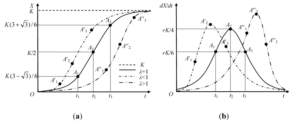 where K is the development index threshold of the system, representing the maximum capacity of the system, and K > 0; r is the growth rate of the system development index, and r > 0; λ is the comprehensive influence index; B = λC; and finally, C is the integration constant. In the Richards model, the shape of the curve changes with λ (Figure 5). Due to the dissimilarity between resource endowment and socio-economic development, HOSs have different regional evolutionary characteristics. This paper maintains that the development index of the system K = 1, because the SDA values were between 0 and 1 following data standardization; the growth rate r was the average growth rate of the SDA values, which was calculated using and λ was an estimated parameter. SPSS (version 19.0) was used to fit the nonlinear Richards equation.
