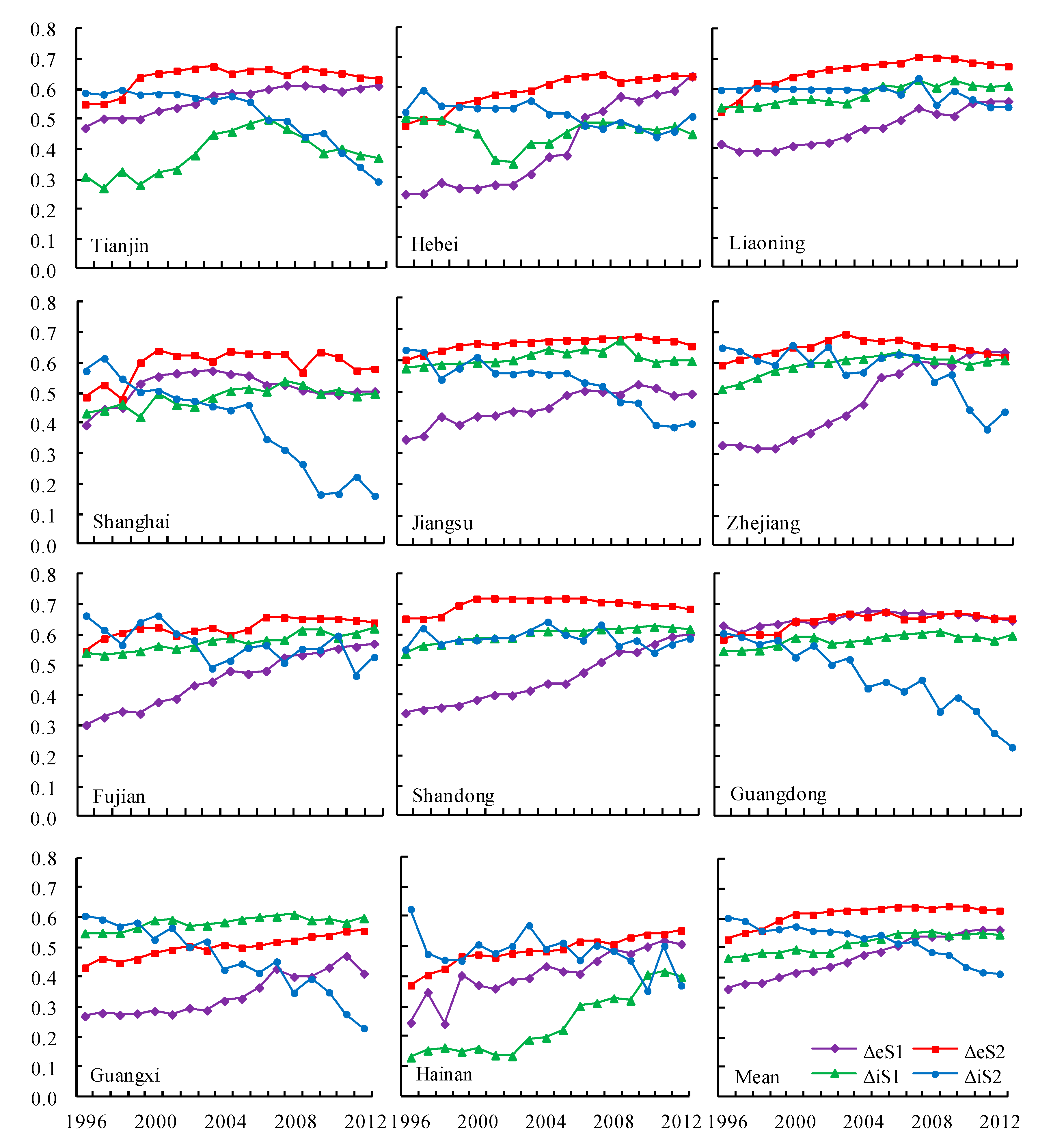 where ΔS represents the four types of entropy: supportive entropy (ΔeS1), consumptive entropy (ΔeS2), destructive entropy (ΔiS2), and reductive entropy (ΔiS1). The parameter i (i = 1,2,…,n) represents an indicator, j (j = 1,2,…,m) represents a year. Year-based S can be expressed where xij is the value of the indicator i for year j, qij is the standardized value of xij calculated from raw data, and .The value size of entropy can express the changes in system affordability. For the four aspects, ΔeS1 and ΔiS1 are positive indicators, with larger values indicating greater coordination in the system; ΔeS2 and ΔiS2 are negative indicators, with larger values denoting less coordination in the system [34].
