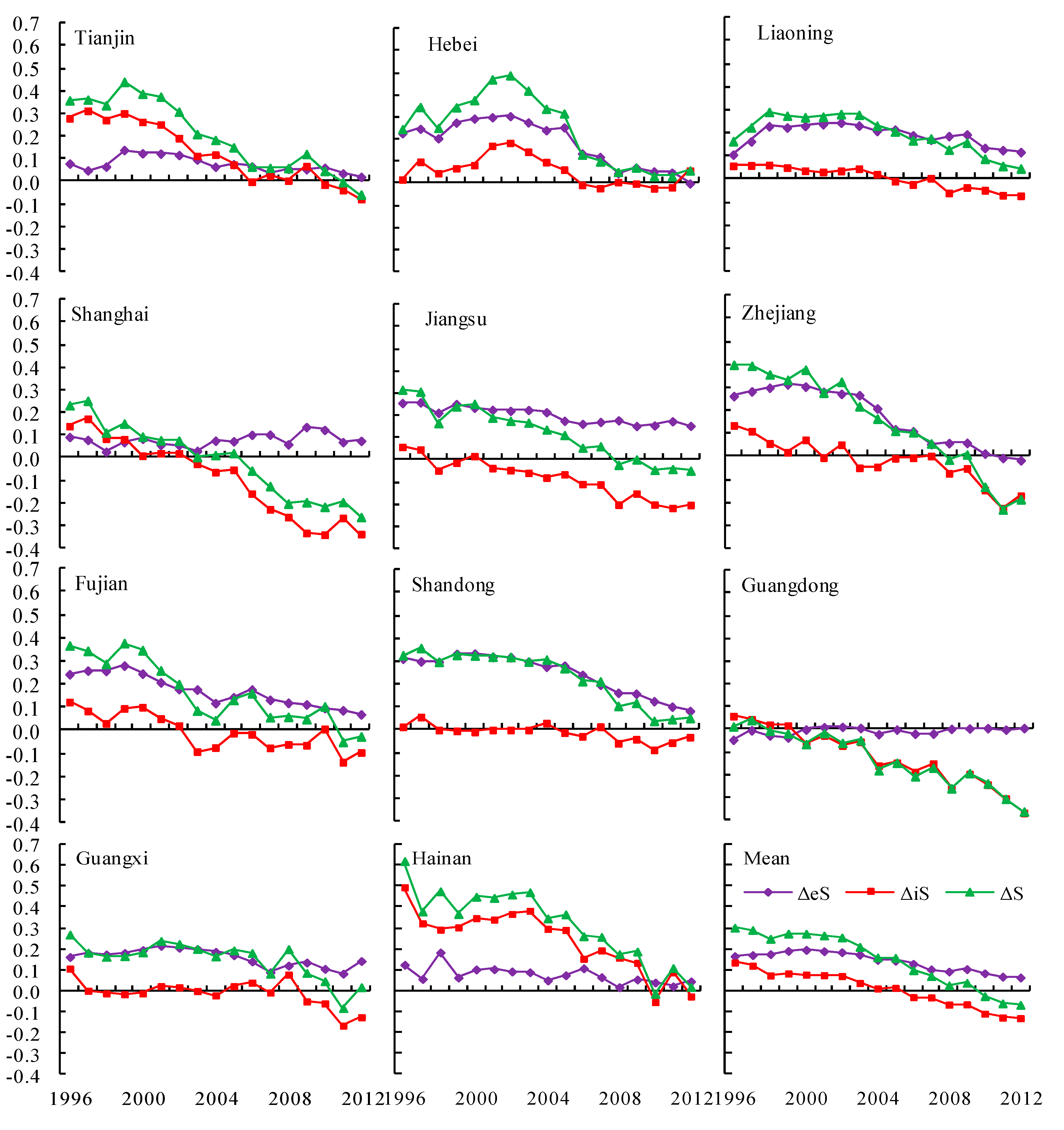 ΔeS is generated from the discrepancy between the output and consumption levels, representing the level of harmony within the HOSs. ΔiS is generated from the difference between the degree of environmental destruction and protection capability, representing the vitality of the HOSs. ΔS is the total entropy change in each year of the study period, signifying the health status of the HOSs.