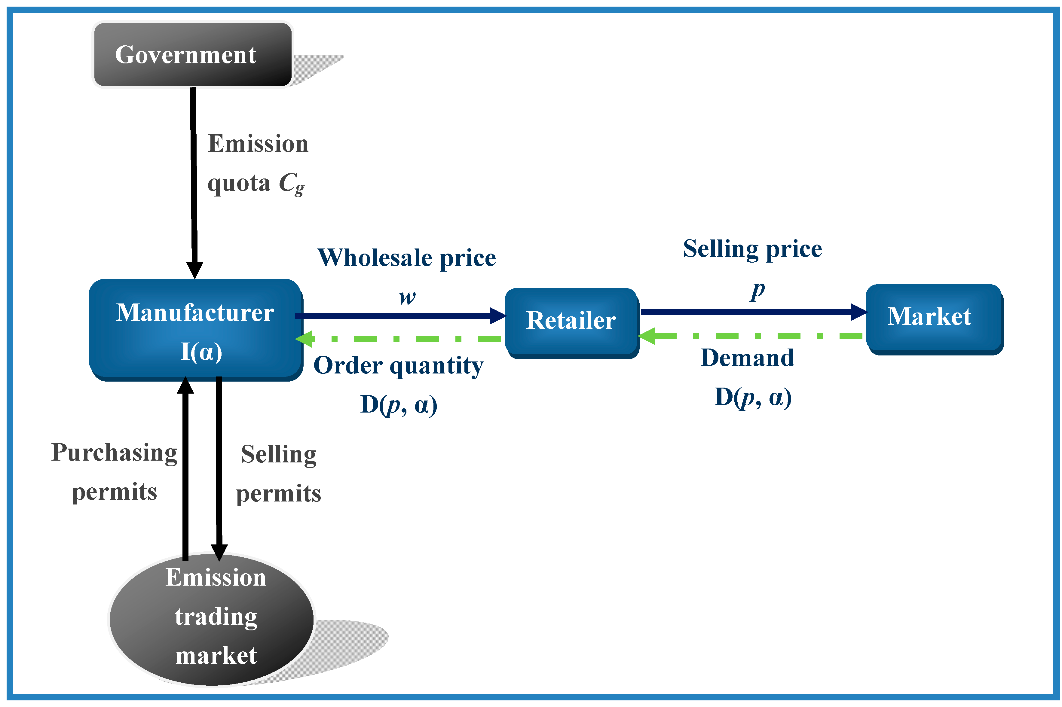 Benjaafar et al. [9] conducted groundbreaking research on carbon emission operation issues by incorporating carbon emission factors into an enterprise’s decision-making model, which produced numerous significant management implications. Associating carbon footprint parameters with various decision variables, they modified traditional models to support decision-making that accounted for both cost and carbon footprint, and examined how the values of these parameters, as well as the parameters of regulatory emission control policies, affected cost and emissions. Hua et al. [10] investigated how firms managed carbon footprints in inventory management under the carbon emission trading mechanism. Aiming at maximizing the profits of the whole supply chain system, Zhao et al. [11] constructed a low-carbon supply chain model and discussed how marginal abatement cost efficiency and emission trading price influenced optimal emission reductions. Du et al. [12] considered the government-allocated emission cap of an emission-dependent manufacturer as a kind of environmental policy and formally investigated its influence on decision-making within the concerned emission-dependent supply chain, as well as distribution fairness in social welfare. Caro et al. [13] introduced a model of joint production of GHG emissions in general supply chains, decomposed the total footprint into each process of which can be influenced by any combination of firms. They analyzed two main scenarios. In the first scenario, the social planner allocates emissions to individual firms and imposes a cost on them in proportion to the emissions allocated. In the second scenario, a carbon leader voluntarily agrees to offset all emissions in the entire supply chain and then contracts with individual firms to share the costs of those offsets. They found that, in order to induce the optimal effort levels, the emissions need to be double counted. This is in contrast to the usual focus in the life-cycle assessment and carbon footprinting literatures on avoiding double counting. Song et al. [14] investigated the single-period problem under three carbon emissions policies and obtained the optimal production quantity accordingly. Considering carbon emissions of transport, Rosič et al. [15] evaluated the economic and environmental sustainability of dual sourcing under two different regulations and found that emission trading was superior to an emission tax on transportation from the perspective of policy-making and management. Konur and Schaefer [16] analyzed the integrated inventory control (with the basic EOQ model) and transportation decisions (LTL and TL carriers) of a retailer under four different carbon emission regulation policies. It was observed that both transportation costs and transportation emissions of the carriers may affect the retailer’s preference. Toptal et al. [17] analyzed a retailer’s joint decisions on inventory replenishment and carbon emission reduction investment under three carbon emission regulation policies, and extended their research through considering the existence of environmentally sensitive customers. Choi [18] studied how to design carbon footprint taxation scheme to apply to a QR system to enhance environmental sustainability. He et al. [19] proposed two representative modes for carbon emission reduction-vertical transfer payment contract and third-party carbon emission reduction service providers. They analyzed the corresponding Stackelberg game for each model and compared emission reduction effectiveness. Wang et al. [20] consider a problem of choosing an appropriate channel for the marketing channel structure of remanufactured fashion products. Han et al. [21] incorporate both price competition and service competition into a supply chain model of a manufacturer and two competing retailers.