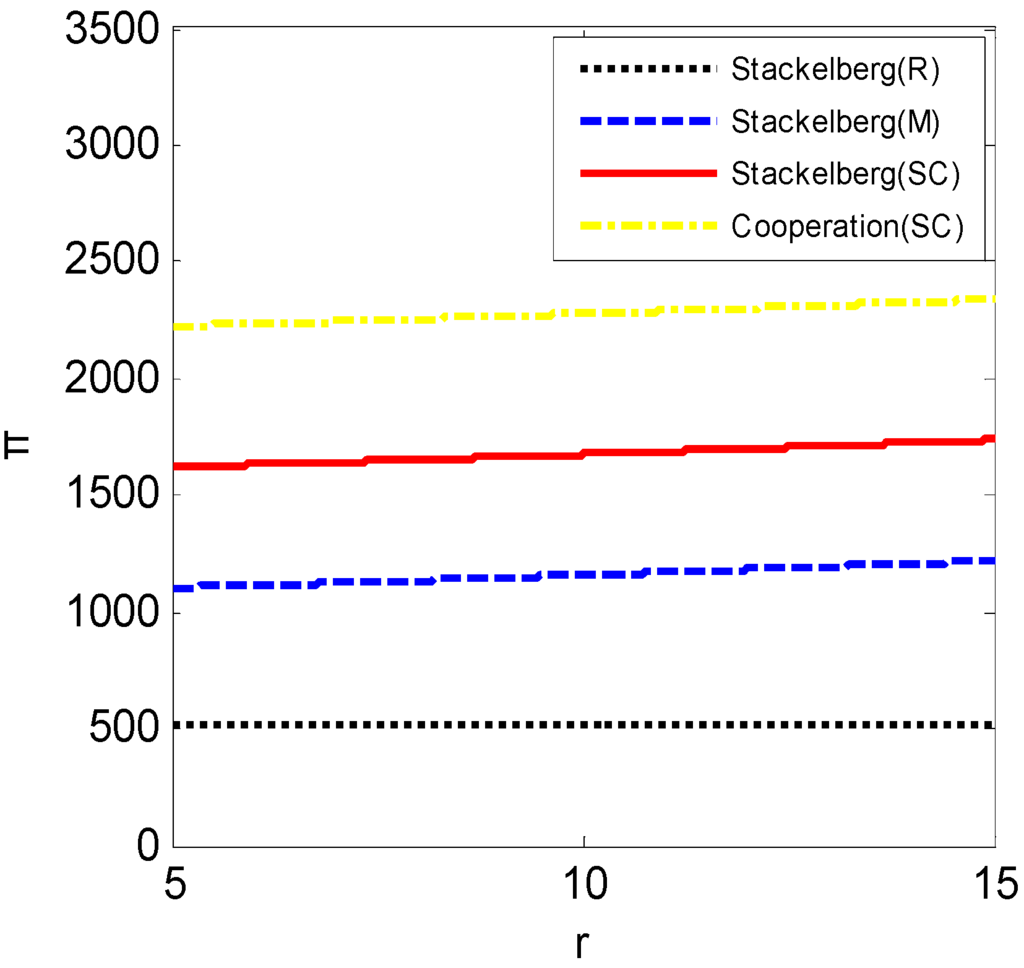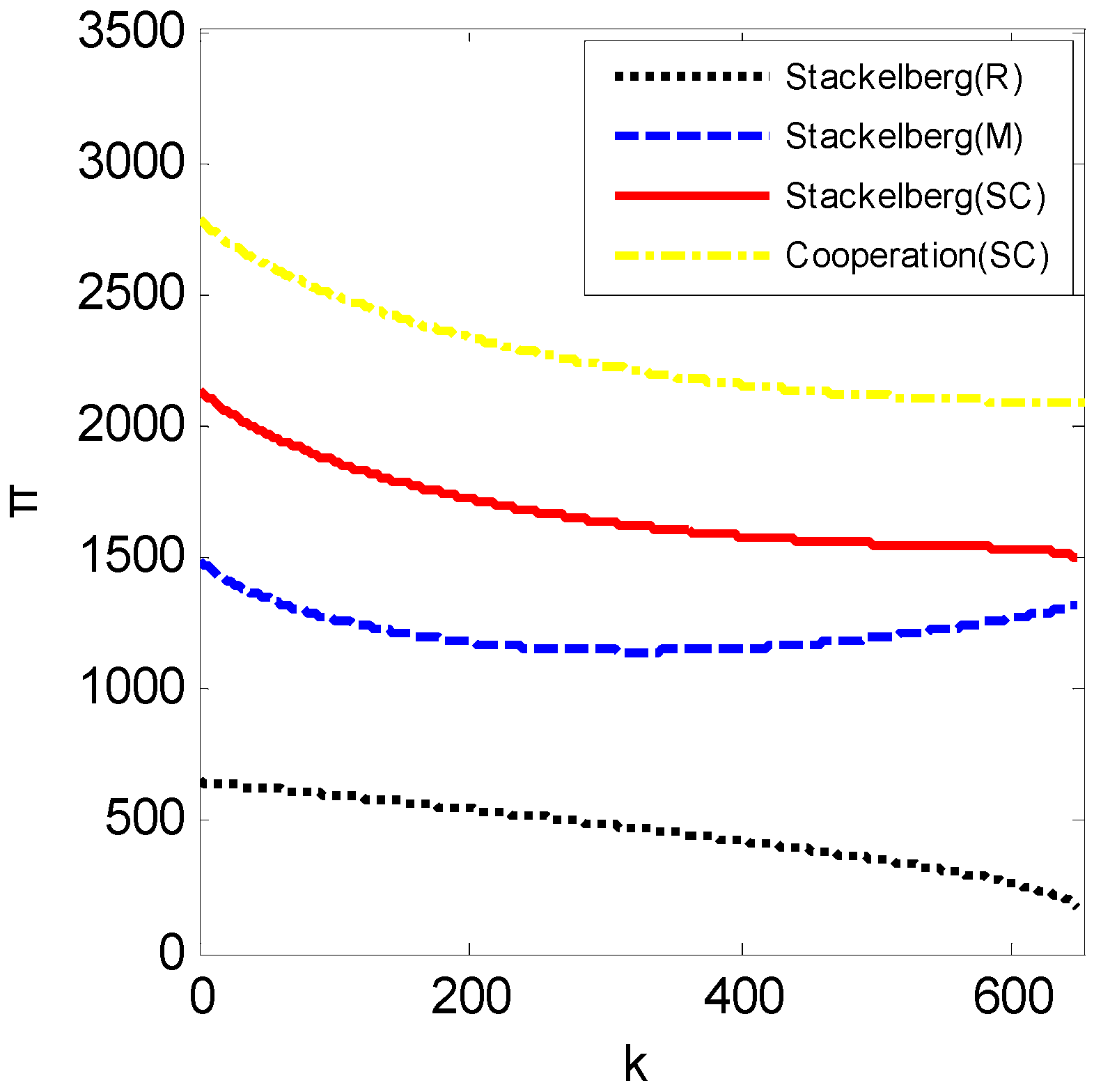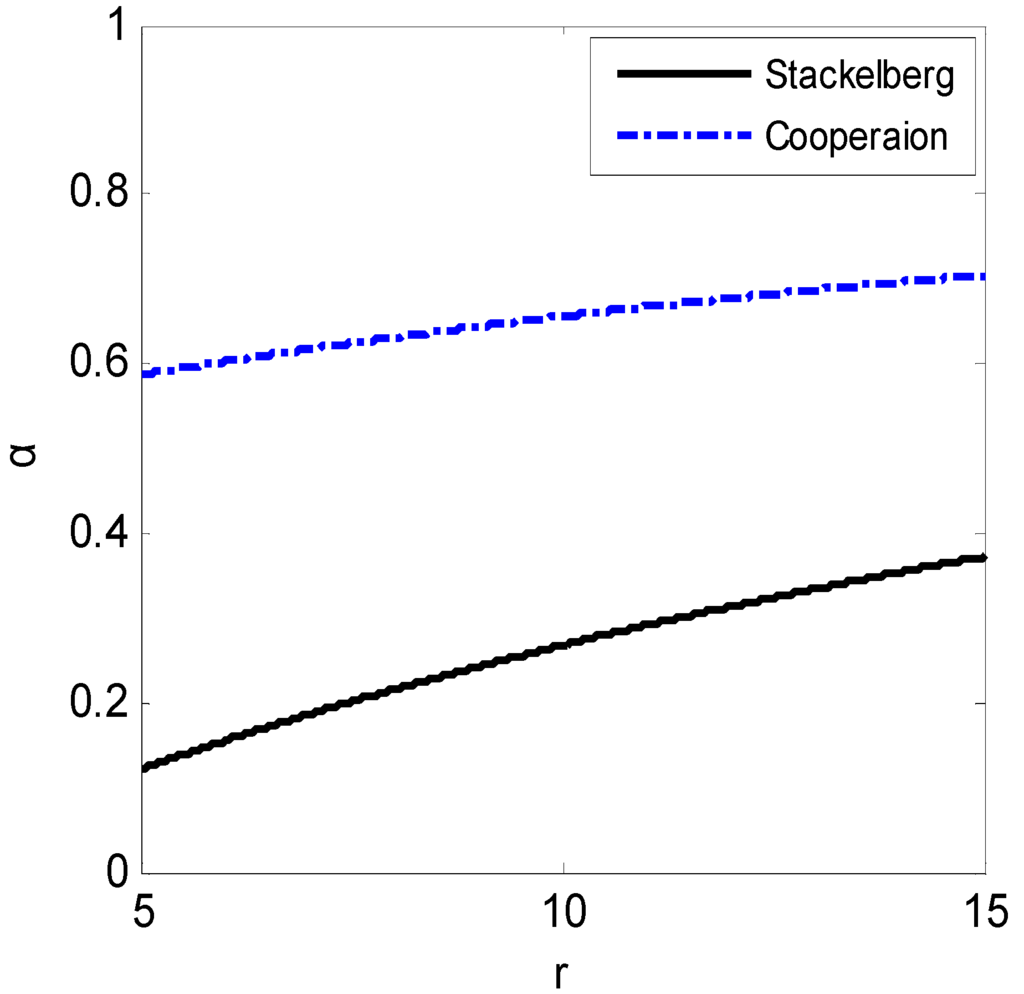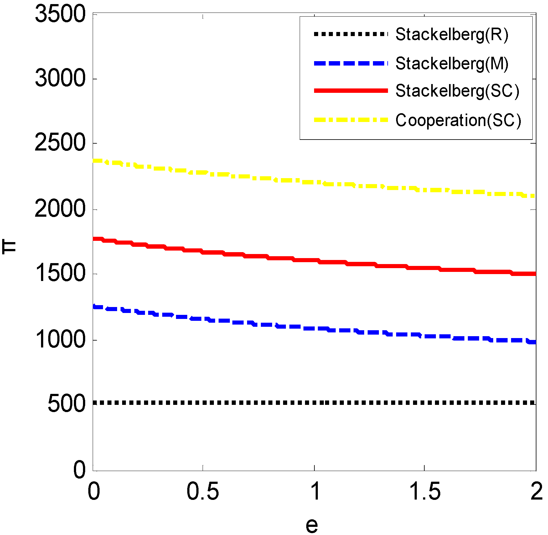 It is not surprising that, in the Stackelberg Model, the retailer will benefit from the manufacturer’s emission reduction investment since it will boost the market demand. While for the manufacturer and the whole system, it must trade off between the cost of emission reduction investment and the extra sales revenue it brings.