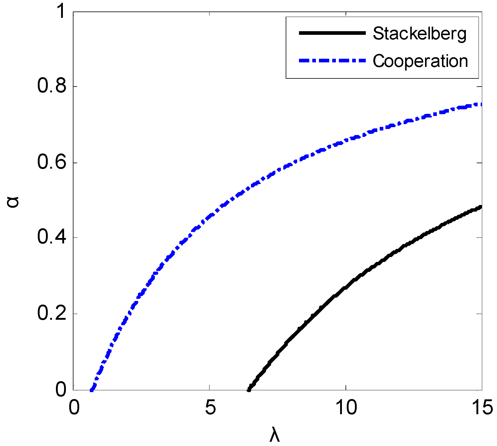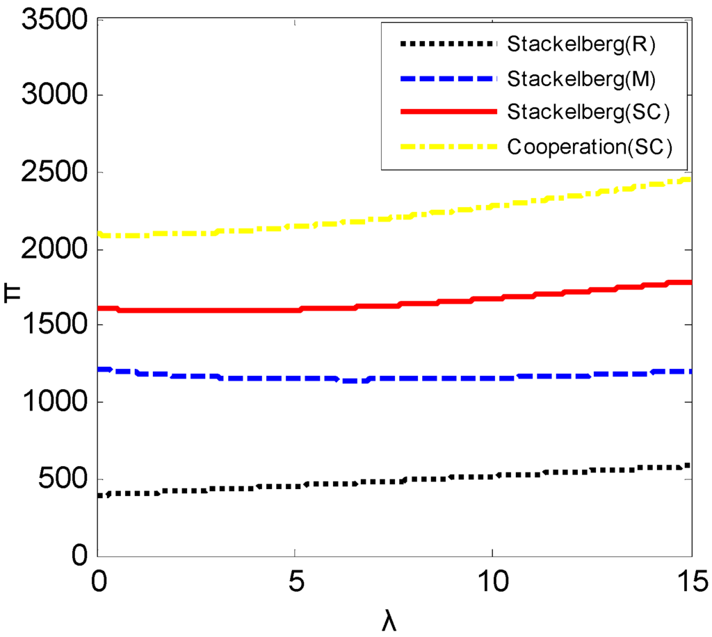 where p (<a) is the retail price and a is market size. λ is a coefficient that measures the impact of emission reduction on market demand, and we name it consumer preference coefficient of low carbon. With a high λ, the demand is more sensitive to α.