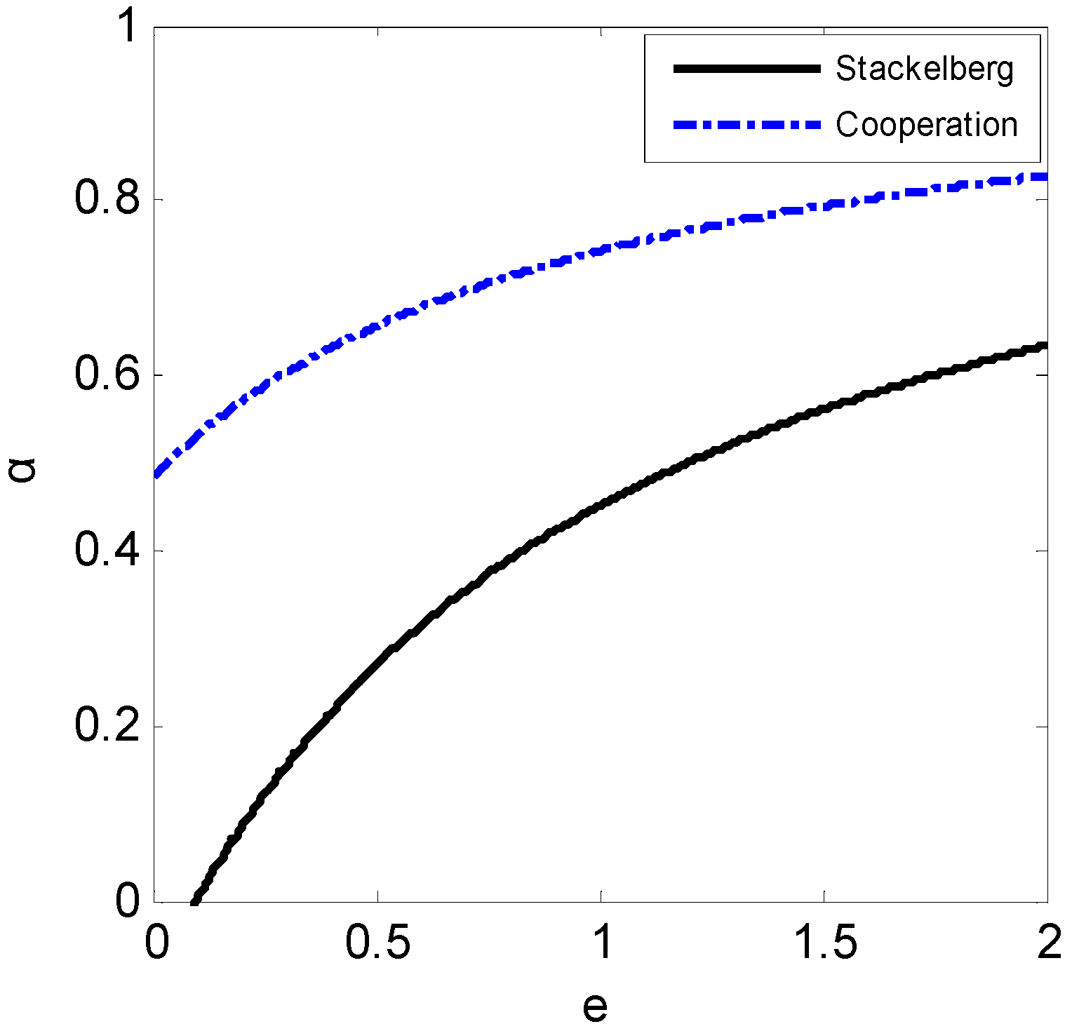 It is intuitive that, with the emission reduction difficulty increases, the manufacturer will decrease her emission reduction level. In terms of the impact of the cap-and-trade system on the manufacturer’s emission reduction investment, we find that the manufacturer will increase her emission reduction investment with the carbon price increases while the emission quota allocated by the government will not alter the manufacturer’s emission reduction investment. If the emission reduction difficulty is not too great (), the manufacturer will increase her emission reduction level with consumer preference coefficient of low carbon increases.