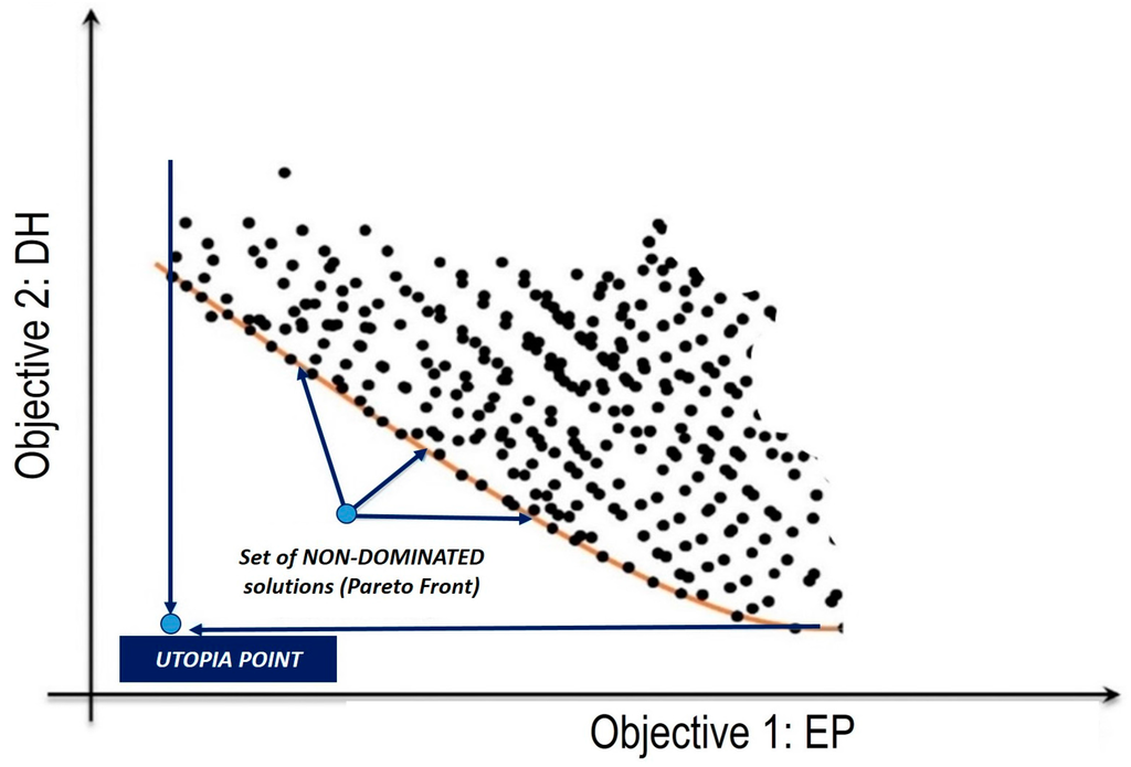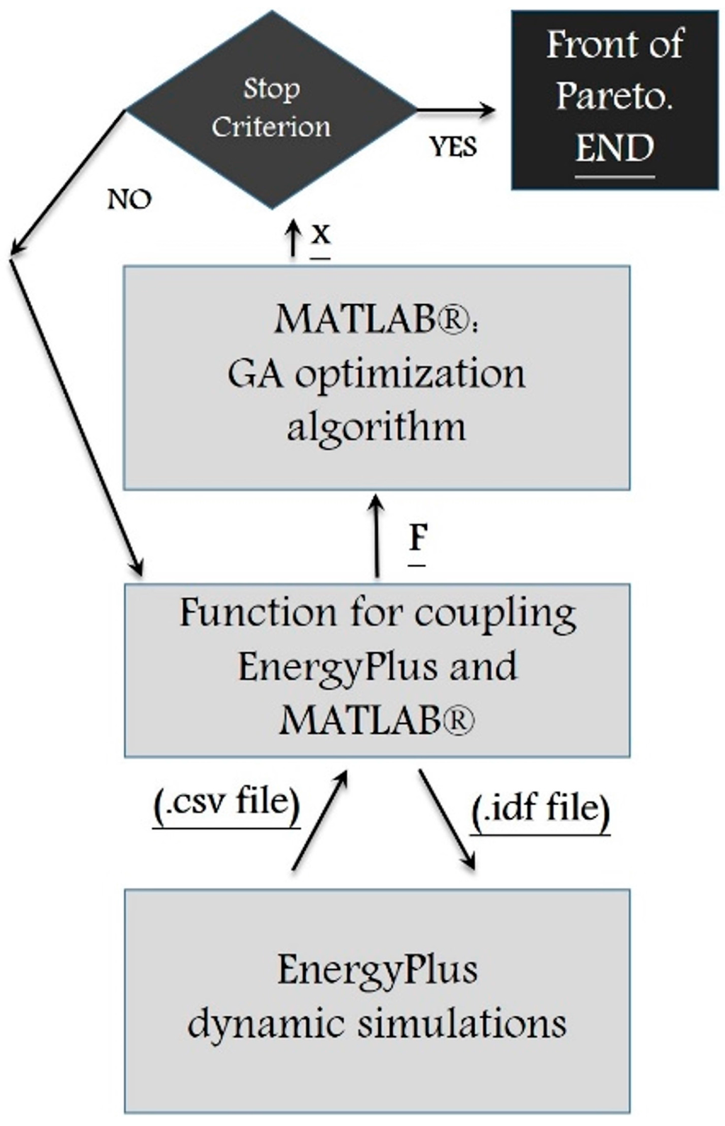 MATLAB® sees EnergyPlus as a generator of hidden functions and this implies the use of heuristic and iterative optimization algorithms, such as the GAs. The final goal of the multi-objective programming problem is the achievement of the Pareto front, which represents the set of non-dominated (i.e., “the best”) solutions. GAs, and heuristic methods in general, do not ensure the detection of the real Pareto front, but produce a good Pareto front (sub-optimal) that is close to the real one in a reasonable computational time.