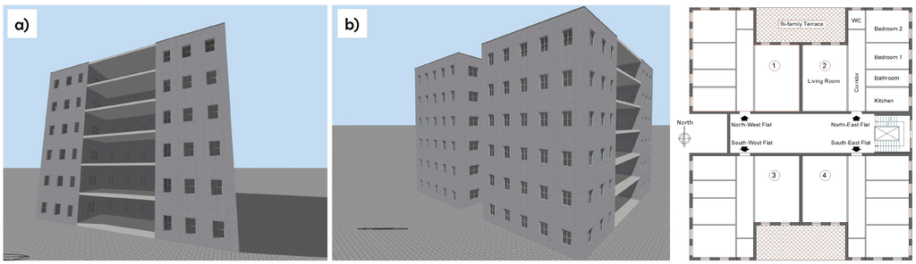 The investigated building (Figure 3) in the next step, diversified on the basis of the variation of the main parameters affecting energy performance, has a common shape, geometry, and structural composition. In greater detail, a residential building is considered. It has six floors above the ground, each one with four apartments. This typology is quite common in all European countries where, starting from the reconstruction following the end of the Second World War, a large use of reinforced concrete has characterized the new texture of the cities. The characteristics of the new technology, lightweight and suitable for multistory buildings, answered the deep demand for dwellings due to great urbanization because of the new job opportunities in urban areas. The building is considered as standing alone, without contiguity or proximity to other buildings, because the objective of this study is the evaluation of the individual edifice and not of its characteristics in relation to others, which could change during the building lifespan. As shown by the admirable review of Nguyen et al. [42], this assumption is adopted in most studies provided by the current scientific literature concerning the optimization of the energy performance of single buildings. A further investigation could consider the same optimization in a dense urban context, and thus by also evaluating the role played by the presence of surrounding buildings (inter-building effect) and urban vegetation.