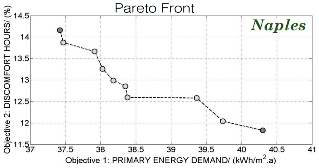 Once the Pareto front is obtained, this is investigated in order to select a solution (i.e., a point on the graph) that represents the best configuration of the building envelope.