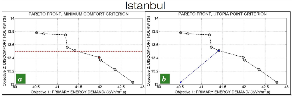Values of the decision variables on the Pareto front for the building located in Istanbul. The solutions selected for the comfort criterion (DHmax = 13.5%) and the utopia point criterion during the MCDM are highlighted.