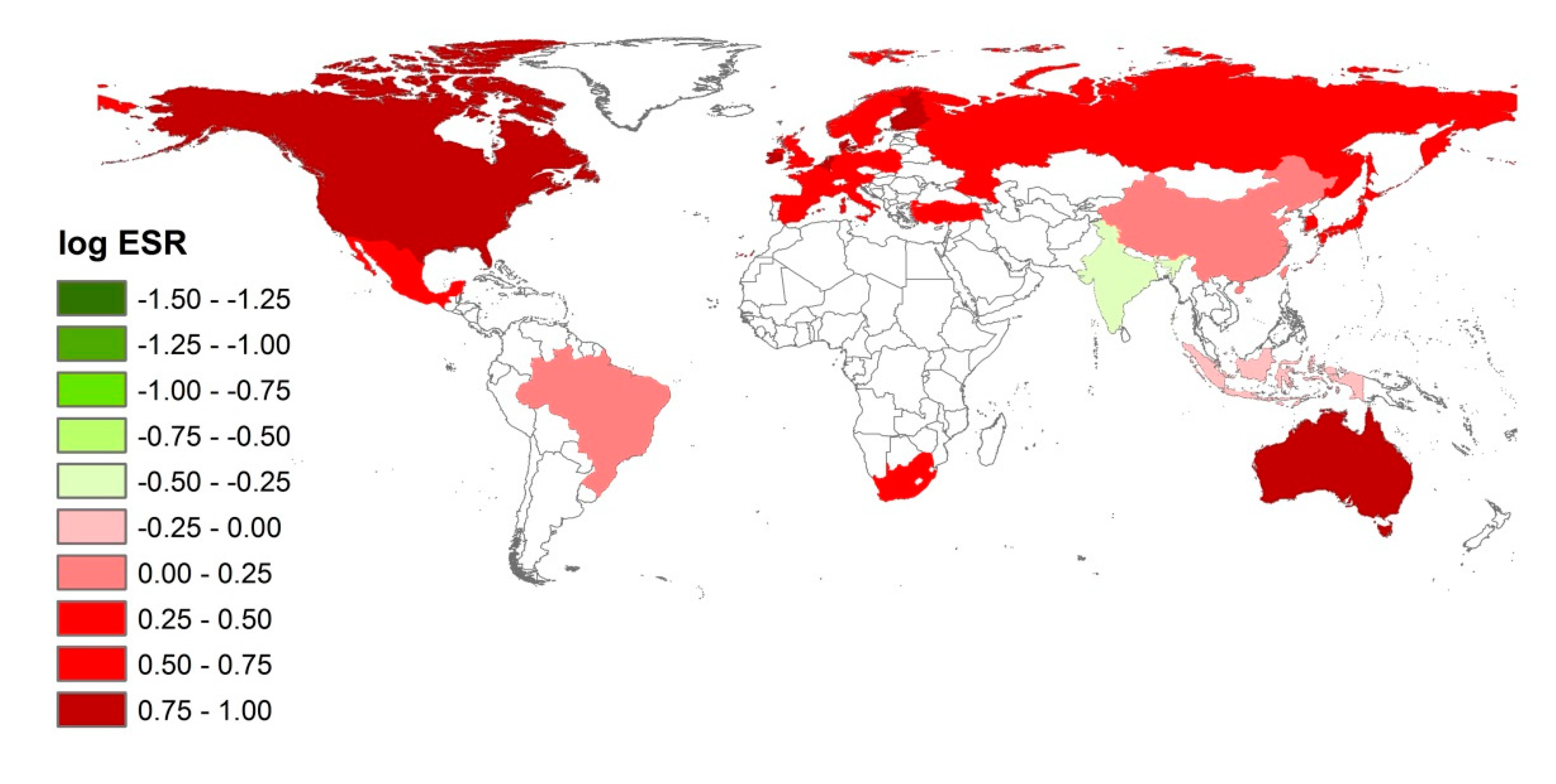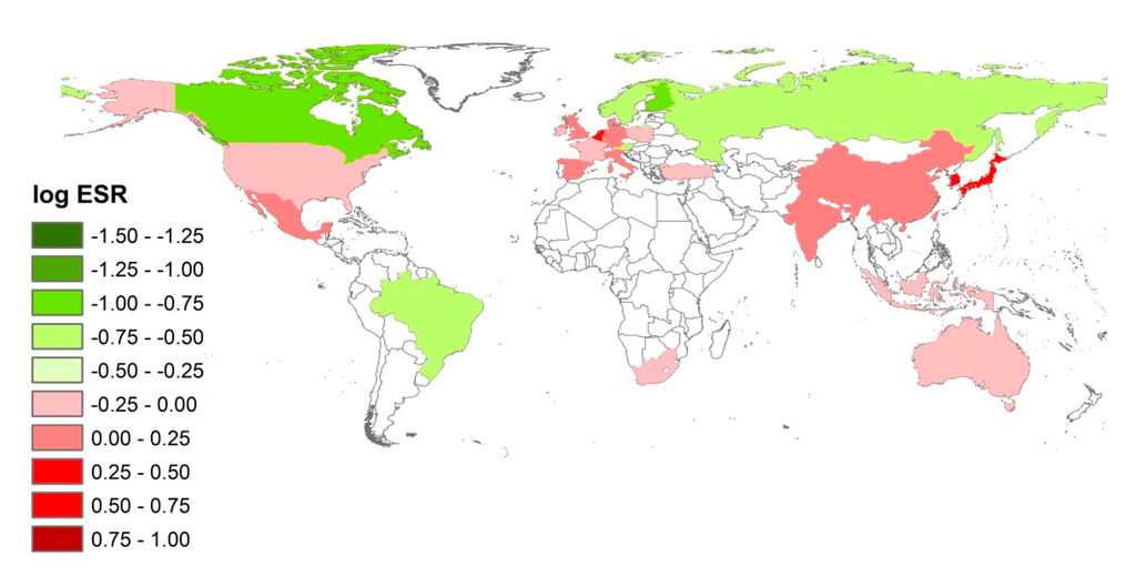 To be consistent across our analysis, the same coloring system is employed to graph the ESRs for all the three environmental issues, namely carbon emissions (climate change), water use, and land use. Further, we choose to display the log(ESR) instead of an ESR, to ensure that a ratio of 2/1 and a ratio of 1/2 are treated equivalently, for instance. We consider this to be superior to data-dependent normalization depending exclusively on what are included in the sample. Countries with environmental sustainability (ESR < 1 or log(ESR) < 0) are shown in green colors, and countries with environmental unsustainability (ESR > 1 or log(ESR) > 0) are shown in red colors. ESR = 1 or log(ESR) = 0 is the magical value. However, one cannot claim to be so precise. For this reason, we define the log(ESR) between −0.25 and 0.25 to be the risky intervals, which corresponds to an ESR between 0.56 and 1.78. While an ESR bounded by less than 0.56 might not be the sufficient conditions for environmental sustainability, we believe that it is a prerequisite for that. In the following, we examine the ESRs for the 28 nations in terms of carbon emissions, water use and land use, respectively.