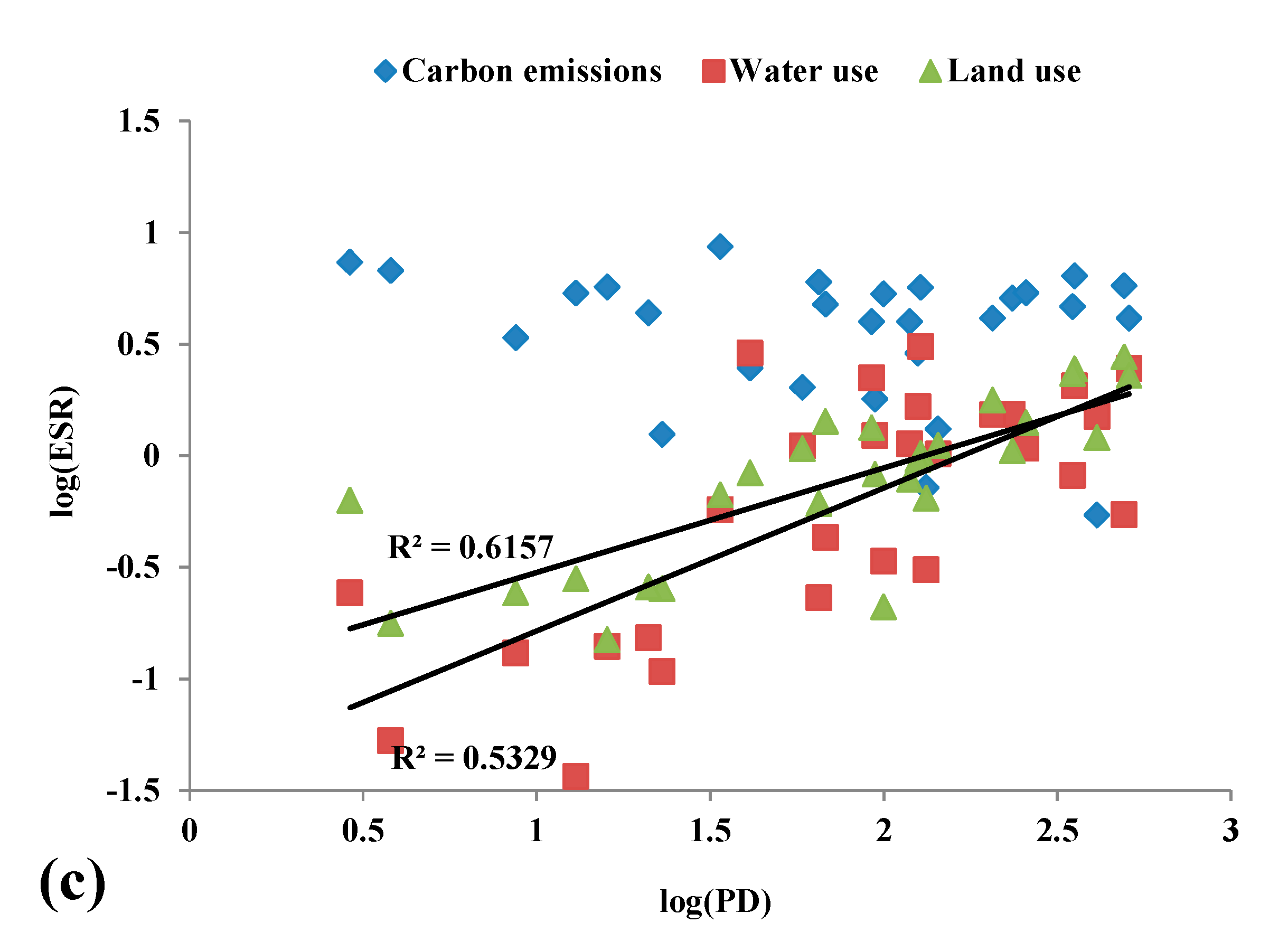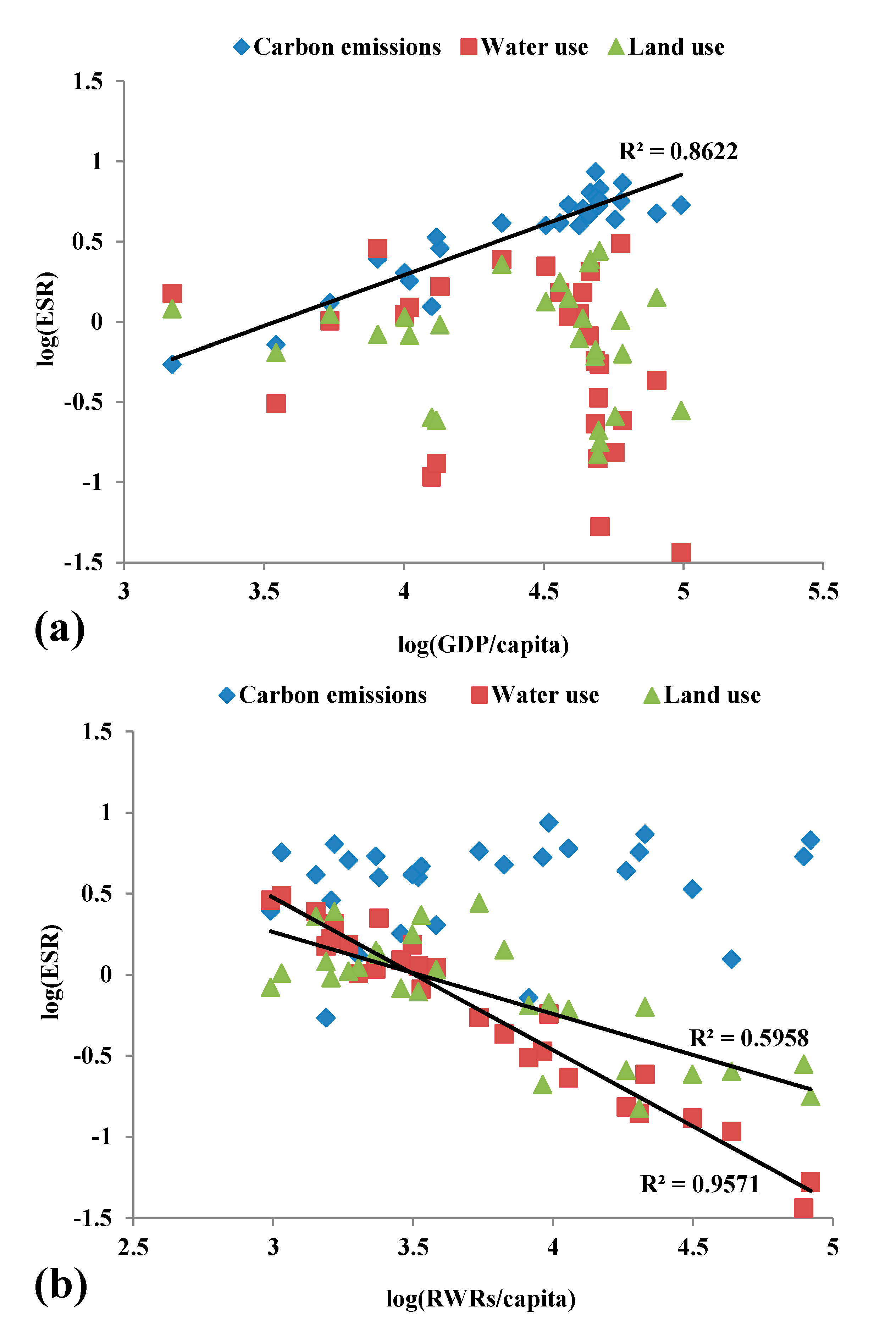 The correlation coefficient between each pair of the explanatory variables indicates that, for the 28 countries on average, approximately 86% of the variation in the log(ESR) of carbon emissions can be explained by log(GDP/capita). This is quite different from the cases of water use and land use, where between 53% and 96% of the variation can be explained by log(RWRs/capita) or log(PD). We further test the three variables together in a multiple regression (Table 2), and see that all the three ESRs are explained very well by the three variables. GDP is a major driving factor for the carbon ESR, but not for that of water and land. For water, the RWRs are highly significant, and for land, the interplay turns out to be more complicated and there is no clear driving factor.