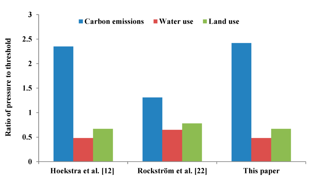 In summary, the unsustainability of carbon emissions is largely driven by the stage of economic development on which a nation finds itself, while resource endowments play a more important role in the degree of unsustainable water and land use (PD can be seen as the inverse of per capita land resources). These findings confirm the fundamental distinction between the systemic and aggregated processes. In addition, Figure 5 shows that the global ESR values for the three environmental issues agree well with other estimates of the ratios of pressures to thresholds in the literature, supporting the conclusions of earlier studies on the transgression of planetary carbon boundary and on the reserve of planetary water and land boundaries. Nevertheless, a major divergence is encountered in the case of carbon emissions, where the planetary carbon boundary is measured based either on joint use of two control variables—atmospheric CO2 concentration and radiative forcing—not allowing to downscale, as is done by Rockström et al. [22], or on an integrated alternative—CO2-equivalent emissions—a mass-based indicator that is more inclusive and expressed in the same unit of the carbon footprint, as is done by Hoekstra et al. [12] and by our study.
