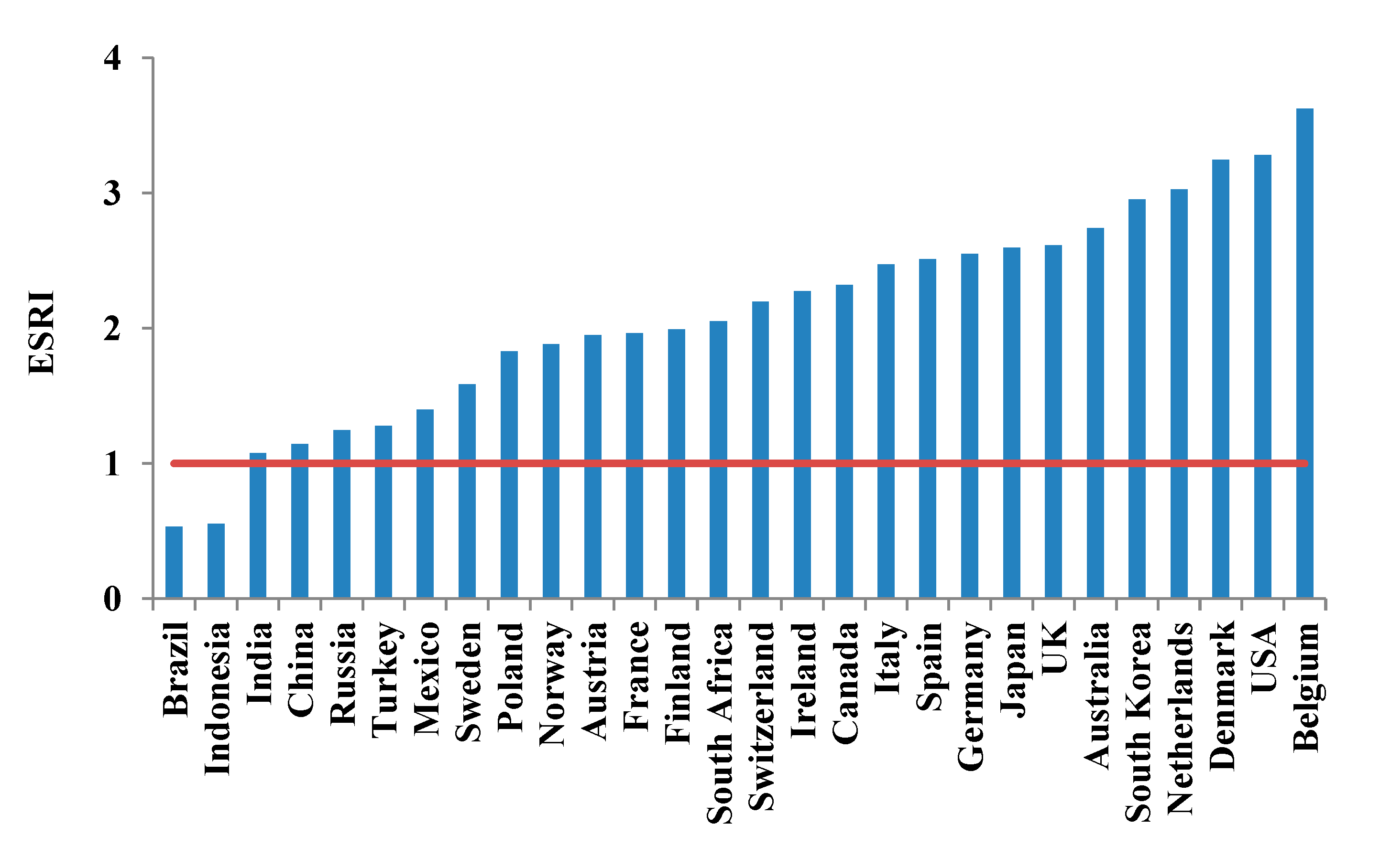To illustrate the idea of weighting without pretending to give a conclusive answer, for each single country, we purposely bring together the three ESRs into an ESR index (ESRI) with an assigned weighting factor of 1/3. All resulting ESRI scores for the 28 countries are presented in ascending order (Figure 6). Specifying an ESRI of 1 as the threshold value for national-scale overall environmental sustainability, we find that only Brazil and Indonesia maneuver within their individual safe operating space, and that the other 26 countries are in the state of environmental unsustainability, with ESRIs ranging from 1.08 for India to 3.63 for Belgium. By carrying out a multiple regression of log(ESRI) on log(GDP), log(RWRs) and log(PD) (Table 3), we find that the ESRI is explained quite well by GDP and the RWRs, but that the PD is not helpful in explaining the weighted ESRI according to 95-percentile confidence intervals. As a whole, the ranking of countries reflects the overall performance of national-scale environmental sustainability influenced by multi-factors, thereby justifying the use of the ESRI in providing a policy-oriented solution to trade-off issues.