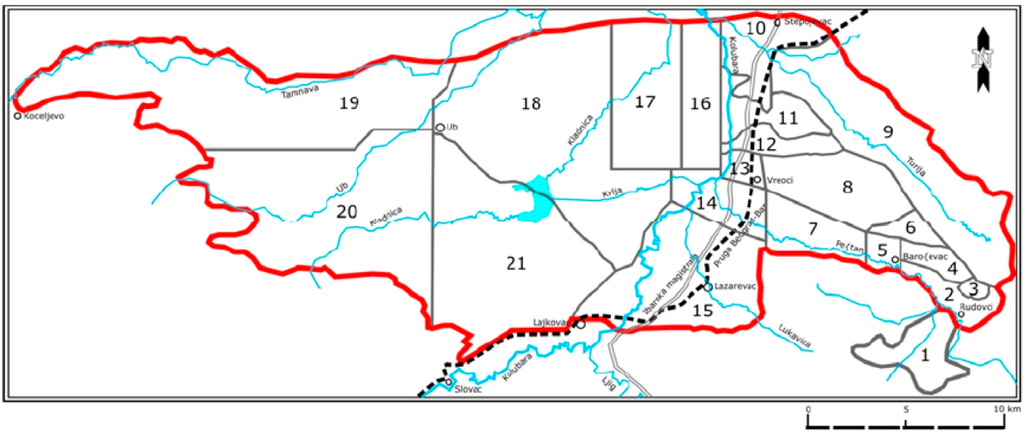 Mining basin (MB) Kolubara: open pits and potential areas for exploitation. 1, Field Kruševica; 2, Field Rudovci; 3, Field A; 4, Field B; 5, Field C; 6, Field Baroševac; 7, Field Е; 8, Field D; 9, Field Turija; 10, Field Stepojevac; 11, Field Veliki Crljeni; 12, Field Volujak-Vreoci; 13, Field G; 14, Field F; 15, Field Šopić-Lazarevac; 16, Tamnava-East Field; 17, Tamnava-West Field; 18, Field Radljevo; 19, Field Trlić; 20, Field Zvizdar; 21, Field Ruklade. Source: [53].