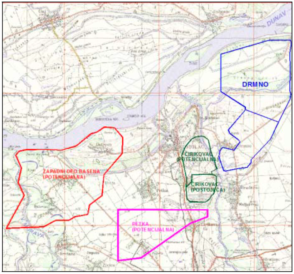 MB Kostolac: open pits (marked with the blue line) and potential areas for exploitation (red, magenta and upper green line). Source: [52].