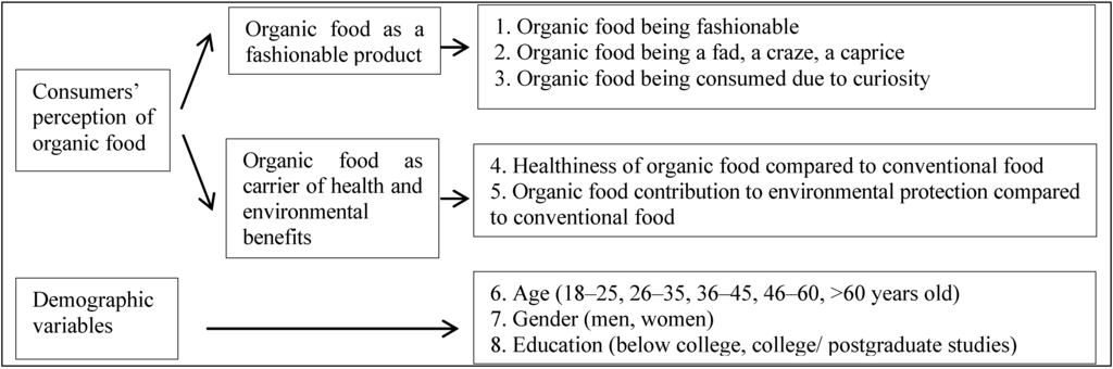 Exacerbated individualism, the financial crisis, and the conflict of cultural and religious identities—astutely analyzed by Samuel Hungtington [1] as “the clash of civilizations”—are just several factors that cause the overthrow of the scale of values, especially moral values, which are seen as generating stability and human development. The search for landmark identity manifests itself in different ways, some of which are quite unexpected. One manifestation refers to green consumerism, a topical phenomenon in contemporary consumer culture [2] that is often seen as a social dilemma [3]. Dawes and Messick [4] define green consumerism—in terms of social dilemma—as a situation in which consumers experience a conflict between their (short-term) individual interests and (long-term) collective interests. As indicated by Schuitema and de Groot [5], if all consumers pursued their own interests, the result would be unfavorable, and, if all consumers only worked toward collective interests, they would benefit in the long term. The increasing consumer demand for quality products, food safety [6], animal welfare or environmental concerns makes organic food an interesting option. The need for agriculture to produce public goods—biodiversity, landscape, reduction of inputs—has been around for some time [7]. EU agricultural policy has shouldered the responsibility for consumers’ new expectations [8], establishing a solid basis for our rural patrimony preservation [9] to produce the required agricultural products and ensuring a position in the world market at the same time [10]. Along with the contribution of policies (agricultural, environmental, rural, etc.) and agribusiness, consumer contributions must also be taken into consideration regarding the success of the organic industry. If experts (in policy, marketing, etc.) understand what consumers think, feel, and do and why they act in these ways, they can take better advantage of the potential of the organic field.