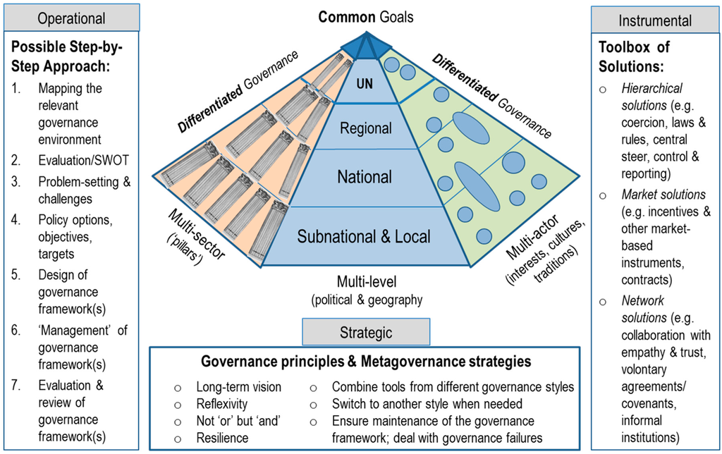 Every country has a different “starting point” and preference for a governance style (combination), due to constitutional settings, traditions, culture, political practice, geography and resulting environmental, social and economic circumstances. Empirical research on governance for SD suggests, however, that countries (or entities at other levels) get only as far as it gets with the one same approach or governance style, and along the way they take up other styles of governance (e.g., [31]). This already points to an approach to governance that will be discussed in this article: metagovernance or the art to design and manage diversified combinations of governance styles, also denoted as “the governance of governance” [32] (p. 106).