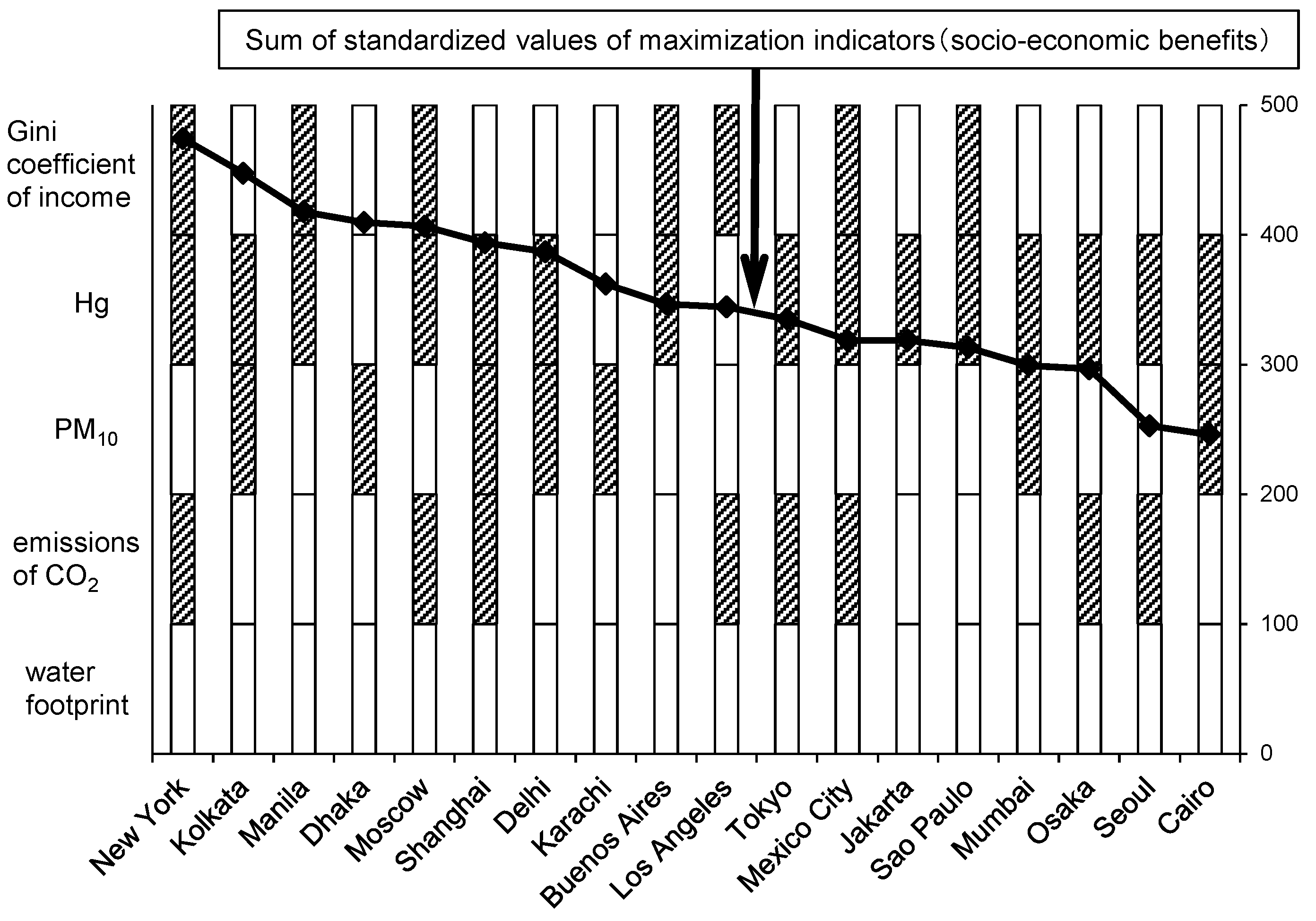 Figure 1 shows the assessment of the 18 megacities using the prototype CSI. The downward-sloping trend line shows the total of the standardized numerical values of the maximization indicators, or in other words, the size of total economic and social benefits. These numerical values do not have any units, and thus no scale on the vertical axis is shown. In Figure 1, the megacities are arranged (from right to left) in an increasing order of the total maximization indicator value. The bar graphs depict the determinations as to whether the necessary conditions for city sustainability are met for the five constraint indicators. Shaded sections indicate that the city is not sustainable in terms of that particular constraint indicator. To our surprise, no megacity satisfied the necessary minimum condition for city sustainability.
