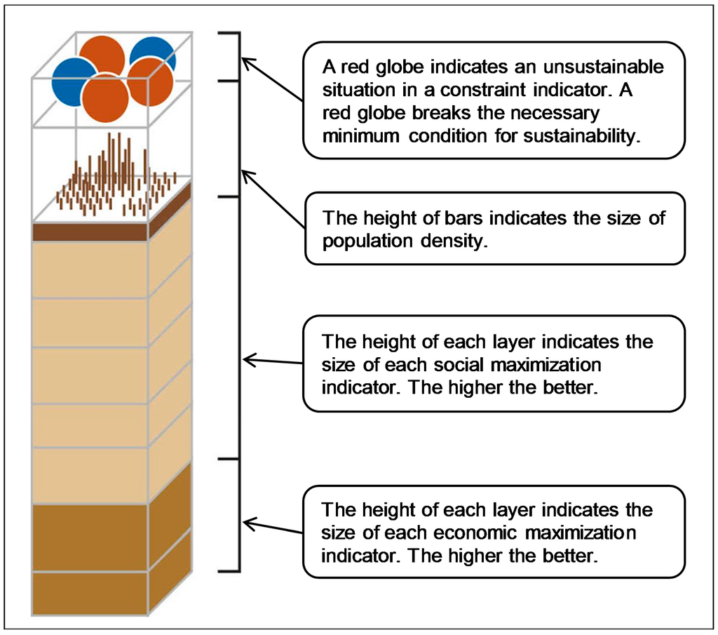 The importance of co-design, co-production and co-dissemination to relevant stakeholders has been increasingly recognized in the field of sustainability research because actions of stakeholders play a significant role in providing real solutions to the problems of sustainability. Academic researchers are required to share the scientific knowledge obtained from academic research with plural stakeholders in real society and link it to a specific social movement towards sustainable society. In this respect, we have created a visualized model of the CSI with which all stakeholders, including non-researchers, can intuitively understand the extent to which an evaluated city is sustainable (Figure 3). The visualized model of an evaluated city consists of four components: conditions of constraint indicators; distribution of population density; conditions of social maximization indicators and conditions of economic maximization indicators (Figure 3).