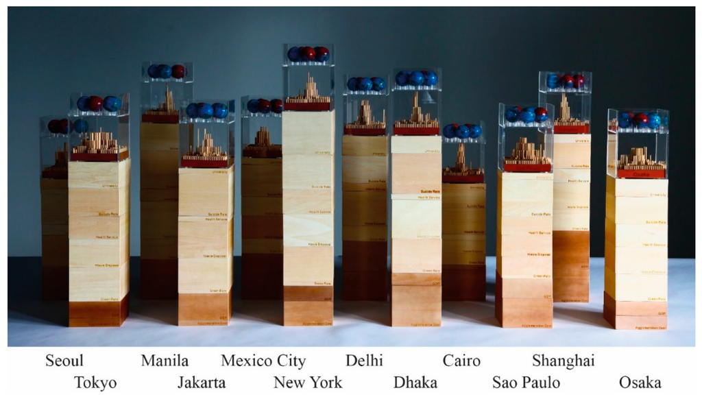 In response to such demands, we have developed an objective system called the “City Sustainability Index” (CSI), which provides a scientific basis for evaluating and comparing cities along the three dimensions of sustainable development (i.e., environmental, economic and social considerations). In addition, we have created a visualized physical model of the CSI to deliver multi-dimensional information in a simple and straightforward manner so that the contents can be readily understood by diverse audiences. The purposes of this paper are to: (1) provide a brief explanation of the concept of city sustainability and its assessment methods; (2) introduce a visualized model of CSI with the results of sustainability assessment applied to 18 world megacities; and (3) discuss several applications and development of a visualized CSI model.