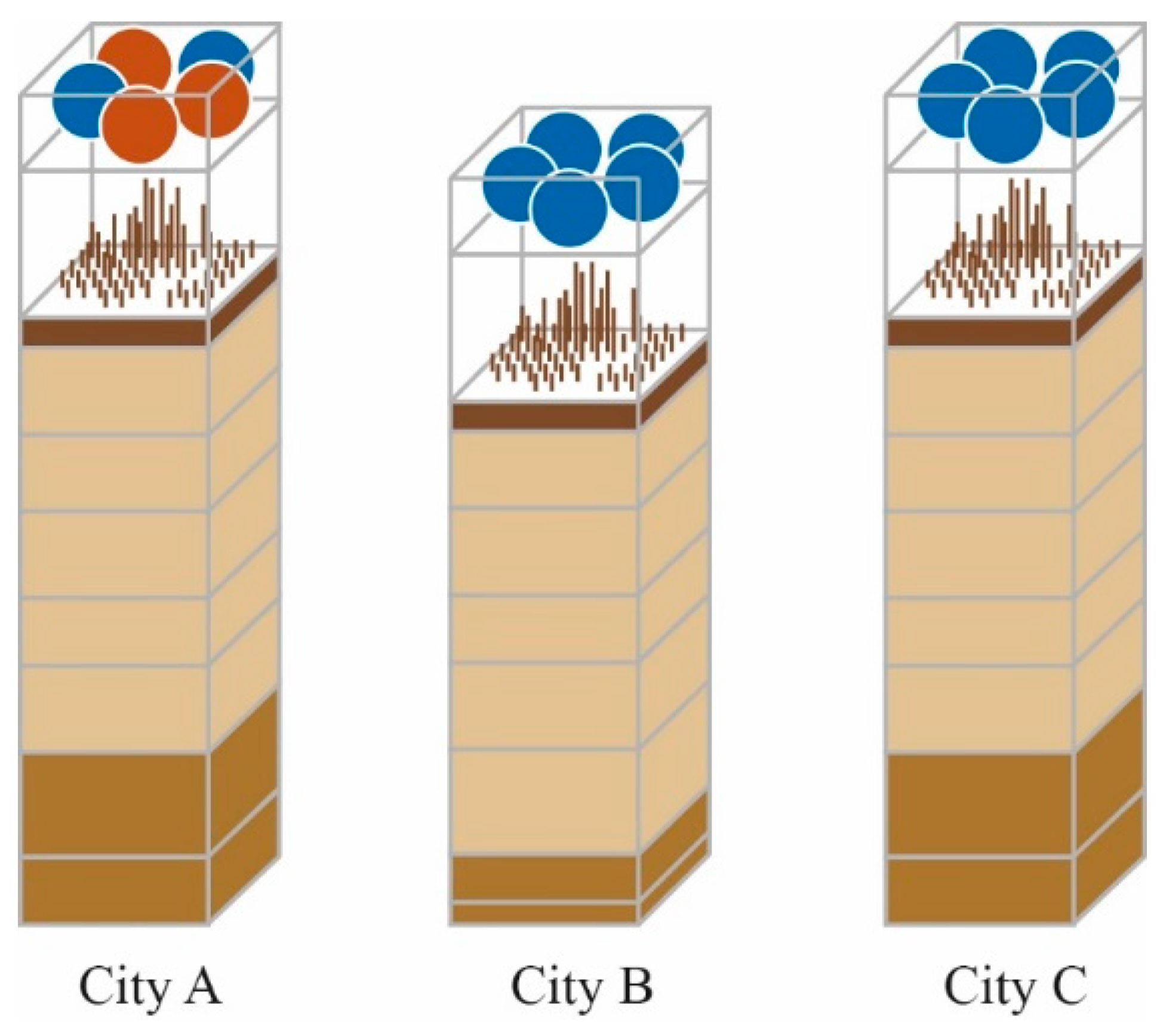 Figure 5 illustrates how two cities can be compared to decide which is more sustainable. The top section of the model shows that City A is not sustainable (i.e., it has red globes) and City B is sustainable (i.e., it has no red globes). In this case, City B should always be assessed as being better than City A, even though the height of the model for City A is greater than that for City B. The heights of the two models indicate that City A generates greater benefits than City B in maximization indicators; however, this advantage is gained at the expense of the global environment. Neither of the models for City B and City C contain red globes, thus it is possible to compare the two cities in a straightforward way. The higher the model is, the more sustainable the city is. Because the model for City C is taller than that for City B, City C produces more socio-economic benefits than City B does, and does so in a sustainable way.