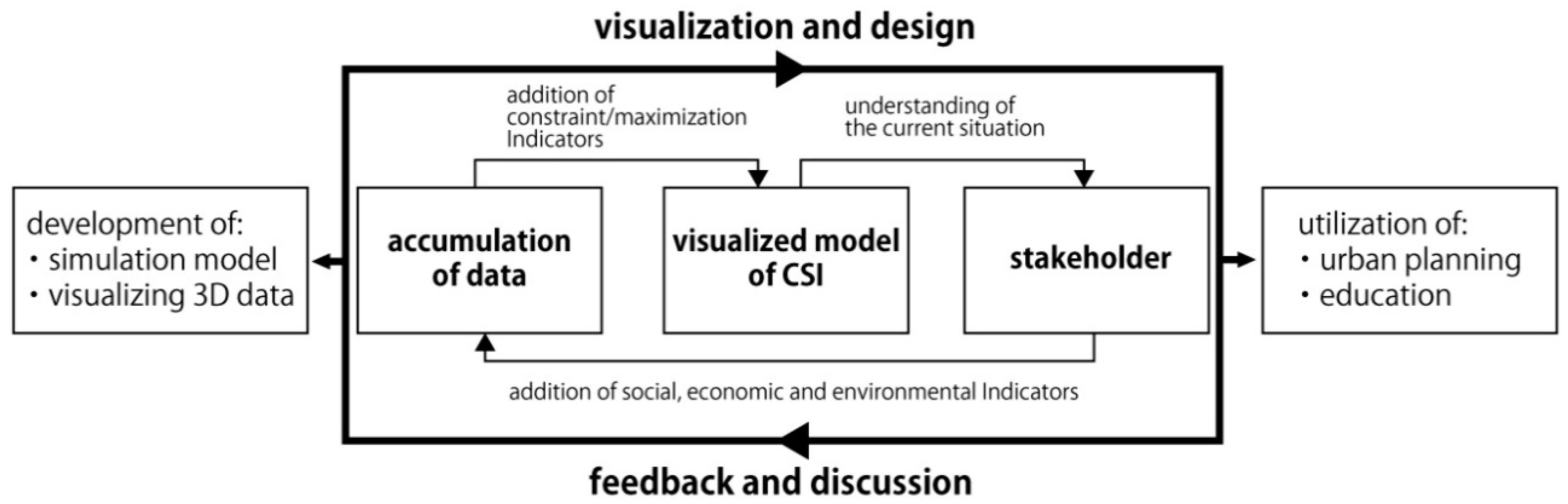 Crucially, for the involvement of appropriate stakeholders and the implementation of relevant policies towards sustainability in cities, complicated information must be conveyed to diverse stakeholders in a simple and straightforward manner so that the current and future situations on sustainability can be readily understood by all the key parties in the process, including non-experts. The visualized model of the CSI can contribute to this conveyance, and also potentially play a significant role in sustainability education.