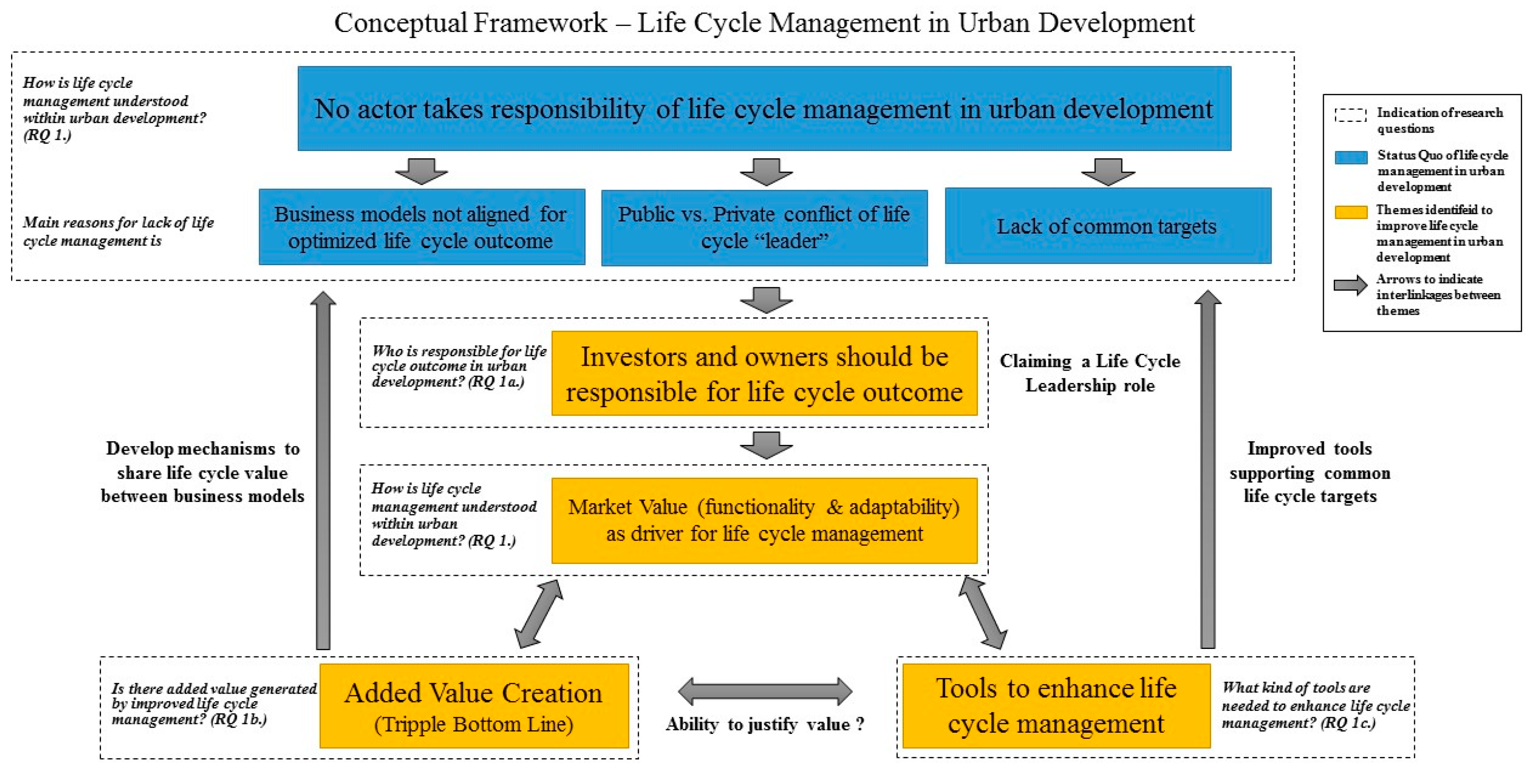 A conceptual framework was synthetized from the research results to present key findings and provide a more holistic understanding of life cycle management in urban development. The research questions of the study are included in the framework in order to link themes and content in the framework. The conceptual framework can be seen in Figure 1.