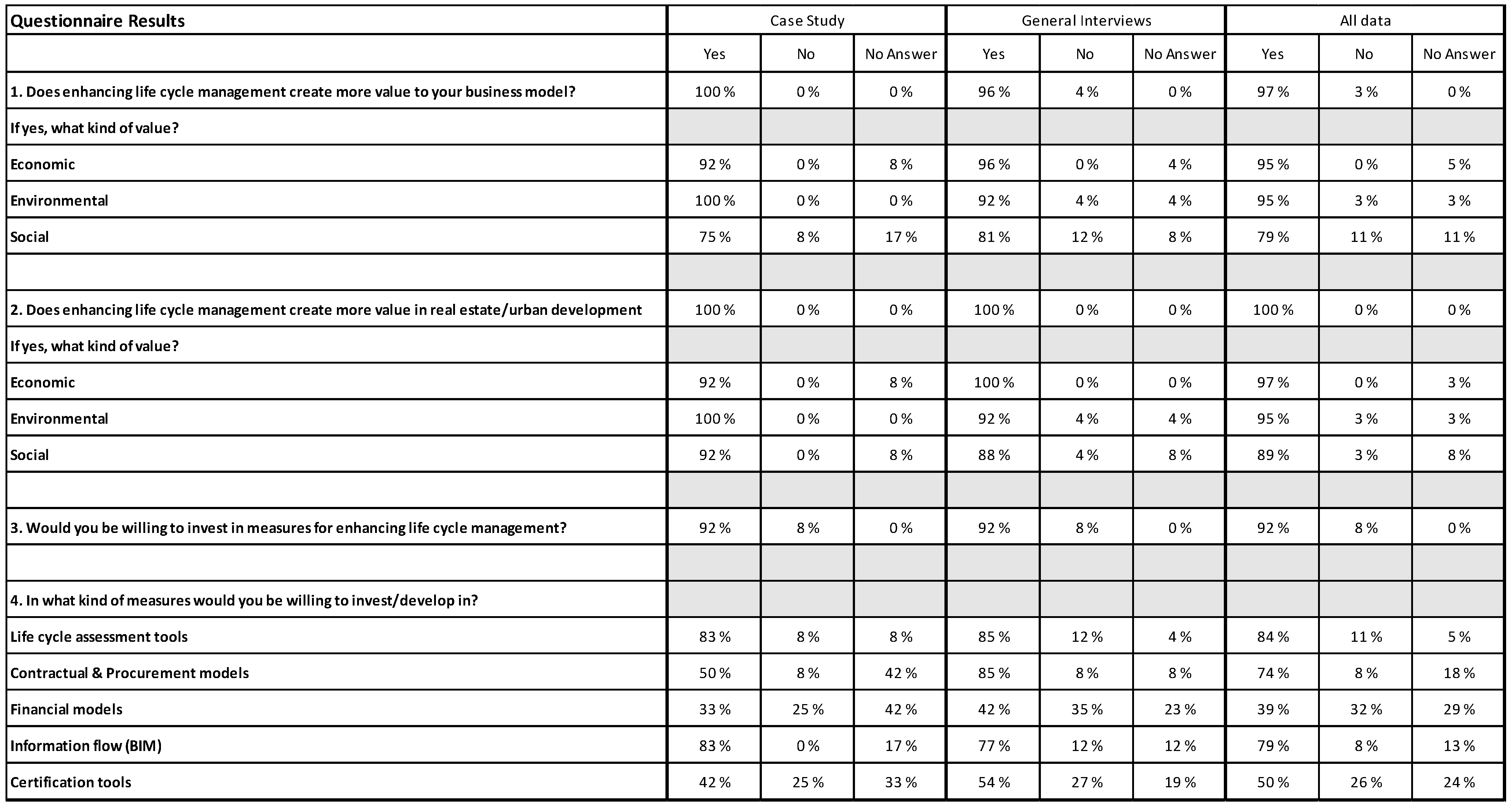 The data content in Appendix 5 and Appendix 6 are almost the same, however all data in Appendix 5 did not receive a clear identification and are thus not represented in Appendix 6. In addition, some answers and comments represent two identified themes and are therefore placed twice. The data was also analyzed across actors and between the case study and independent interviews in order to identify differences. Appendix 6 shows the molded themes which are described in more detail in the results chapter. The questionnaire results (Appendix 4) were used to verify the interview Questions 4 and 5 (Appendix 2). As the research questions are targeted for the whole life cycle data set, the results are presented as an entity.